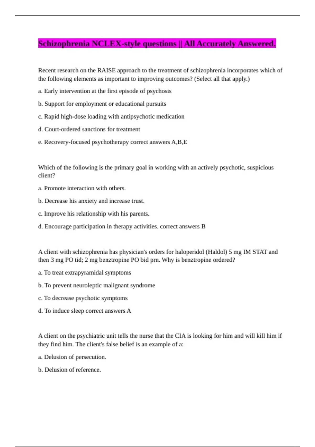 e. Recovery-focused psychotherapy correct answers A,B,E