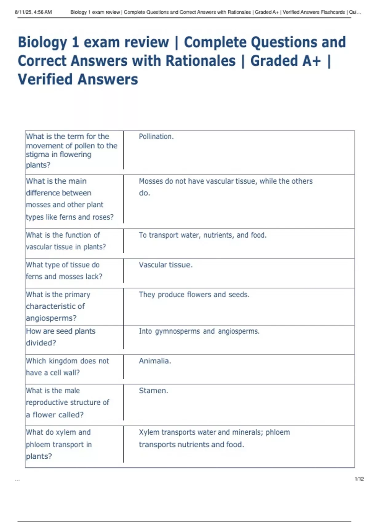 , 8/11/25, 4:56 AM Biology 1 exam review | Complete Questions and Correct Answers with Rationales | Graded A+ | Verified Answers Flashcards | Qui…