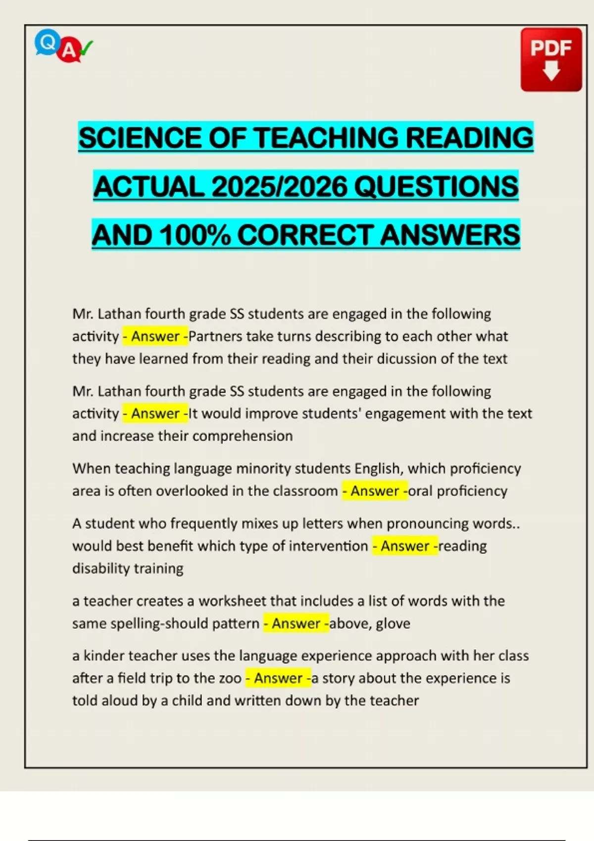 SCIENCE OF TEACHING READING ACTUAL 2025/2026 QUESTIONS AND 100% CORRECT ANSWERS Mr. Lathan fourth grade SS students are engaged in the following activity - Answer -Partners take turns describing to each other what they have learned from their reading and their dicussion of the text Mr. Lathan fourth grade SS students are engaged in the following activity - Answer -It would improve students' engagement with the text and increase their comprehension When teaching language minority students English, which proficiency area is often overlooked in the classroom - Answer -oral proficiency A student who frequently mixes up letters when pronouncing words.. would best benefit which type of intervention - Answer -reading disability training a teacher creates a worksheet that includes a list of words with the same spelling-should pattern - Answer -above, glove a kinder teacher uses the langu