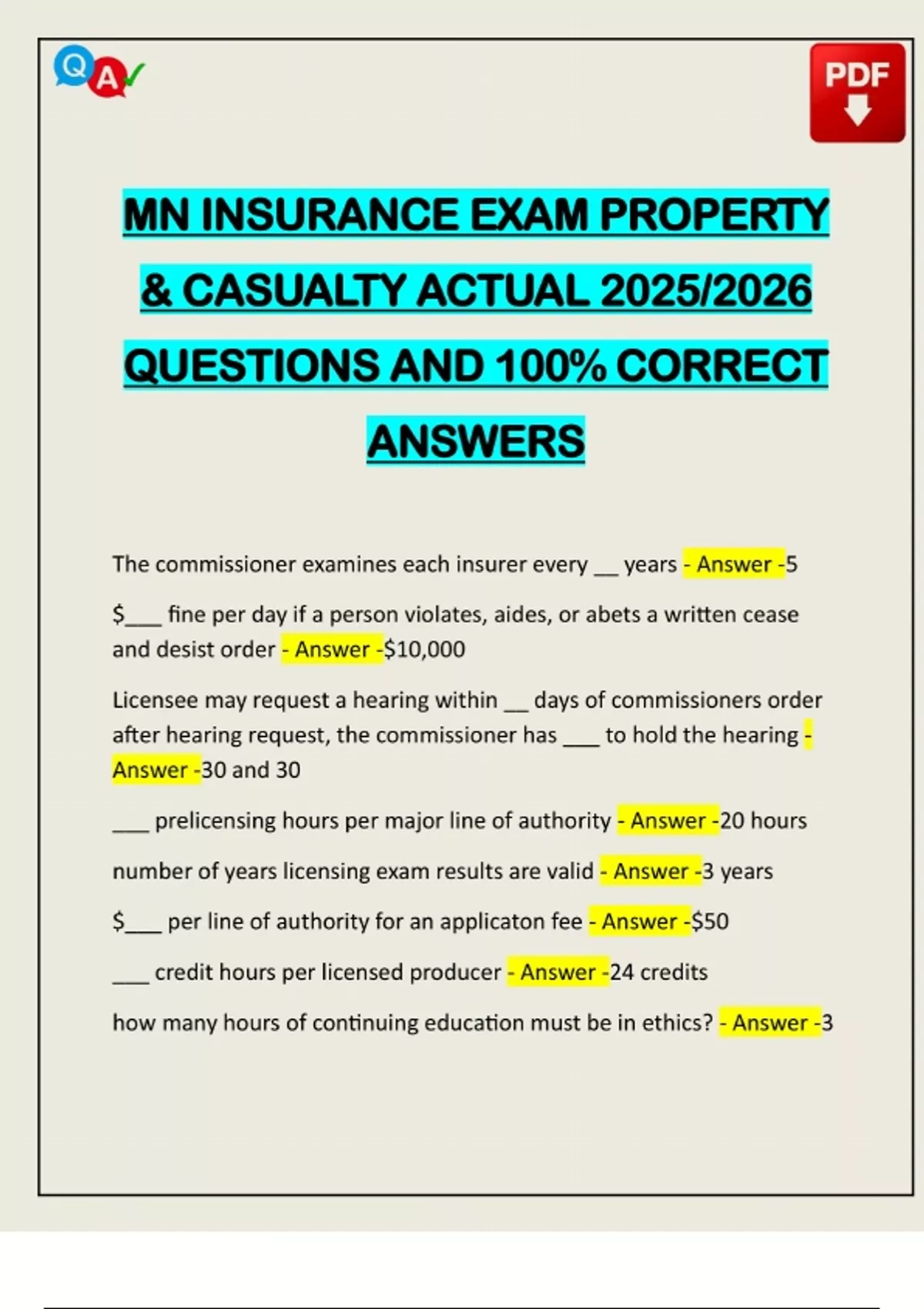 MN INSURANCE EXAM PROPERTY & CASUALTY ACTUAL 2025/2026 QUESTIONS AND 100% CORRECT ANSWERS The commissioner examines each insurer every __ years - Answer -5 $___ fine per day if a person violates, aides, or abets a written cease and desist order - Answer -$10,000 Licensee may request a hearing within __ days of commissioners order after hearing request, the commissioner has ___ to hold the hearing - Answer -30 and 30 ___ prelicensing hours per major line of authority - Answer -20 hours number of years licensing exam results are valid - Answer -3 years $___ per line of authority for an applicaton fee - Answer -$50 ___ credit hours per licensed producer - Answer -24 credits how many hours of continuing educati
