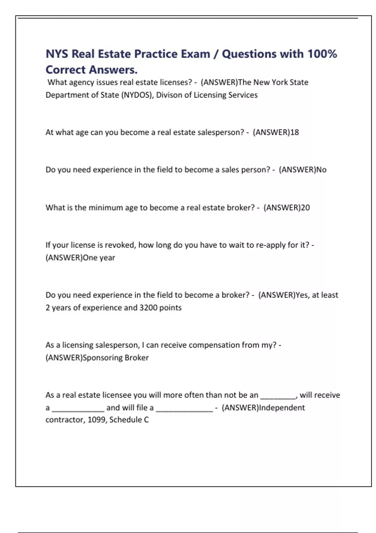 NYS Real Estate Practice Exam / Questions with 100%