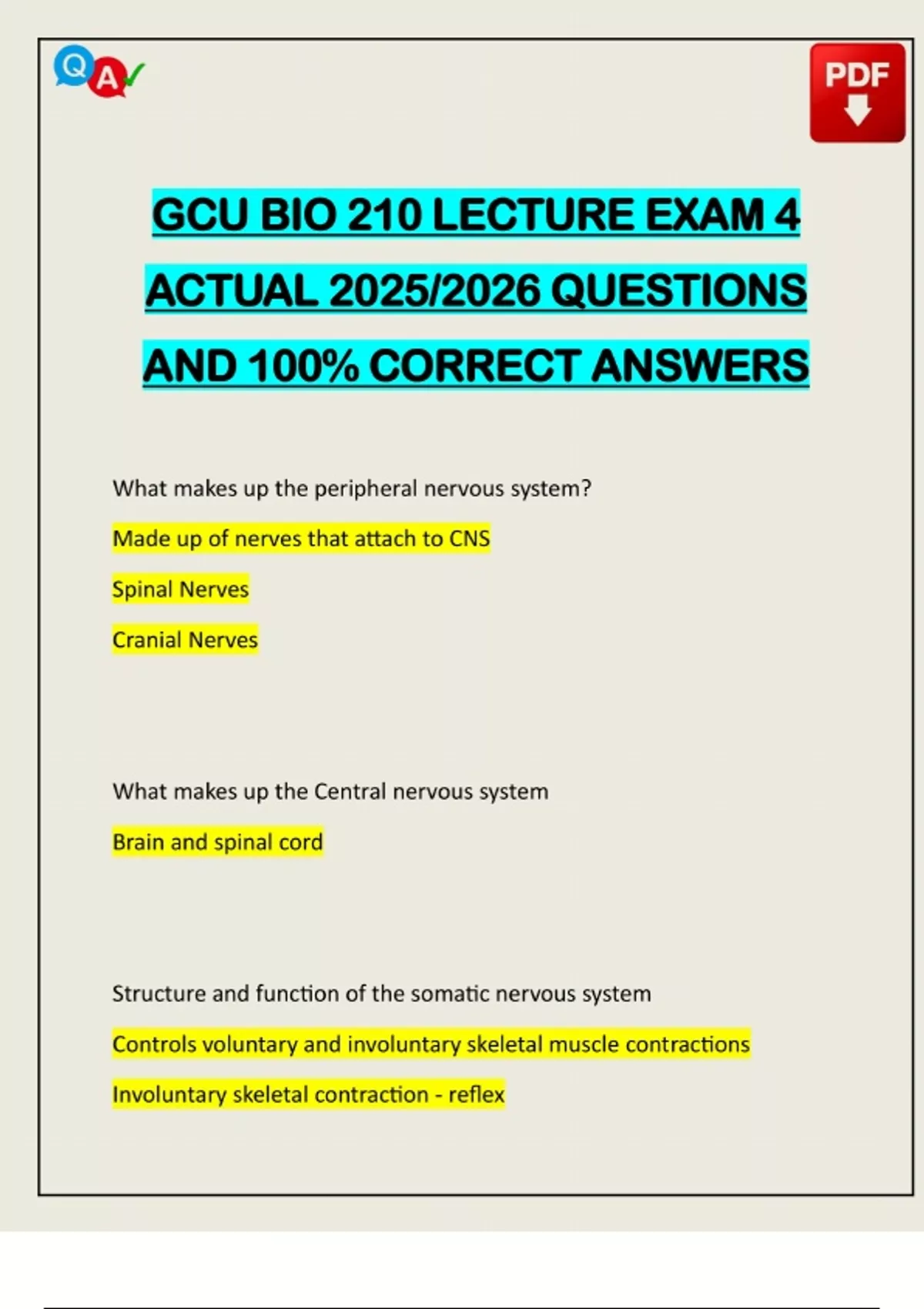 GCU BIO 210 LECTURE EXAM 4 ACTUAL 2025/2026 QUESTIONS AND 100% CORRECT ANSWERS What makes up the peripheral nervous system? Made up of nerves that attach to CNS Spinal Nerves Cranial Nerves What makes up the Central nervous system Brain and spinal cord Structure and function of the somatic nervous system Controls voluntary and involuntary skeletal muscle contractions Involuntary skeletal contraction