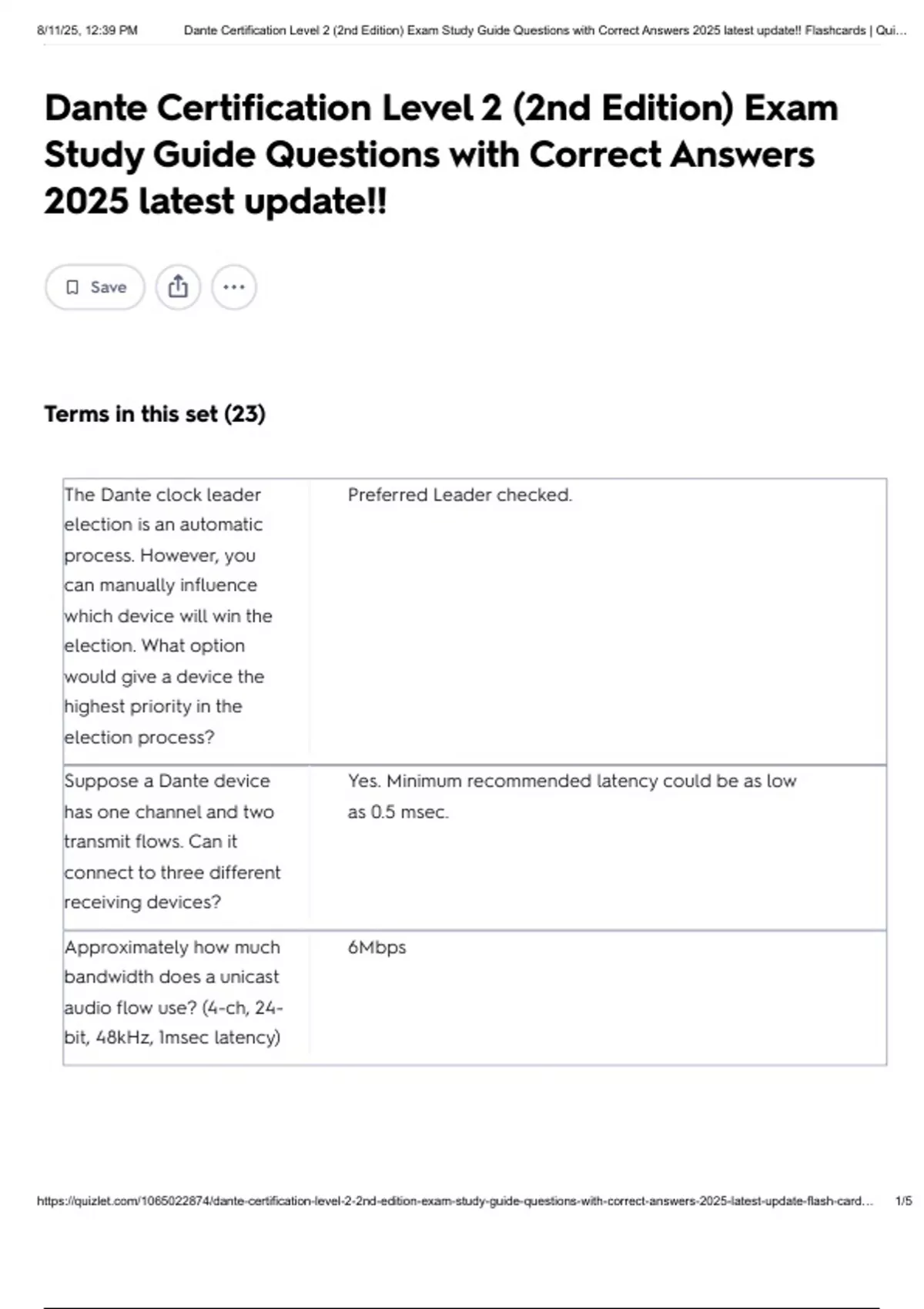 , 8/11/25, 12:39 PM Dante Certification Level 2 (2nd Edition) Exam Study Guide Questions with Correct Answers 2025 latest update!! Flashcards | Qui…