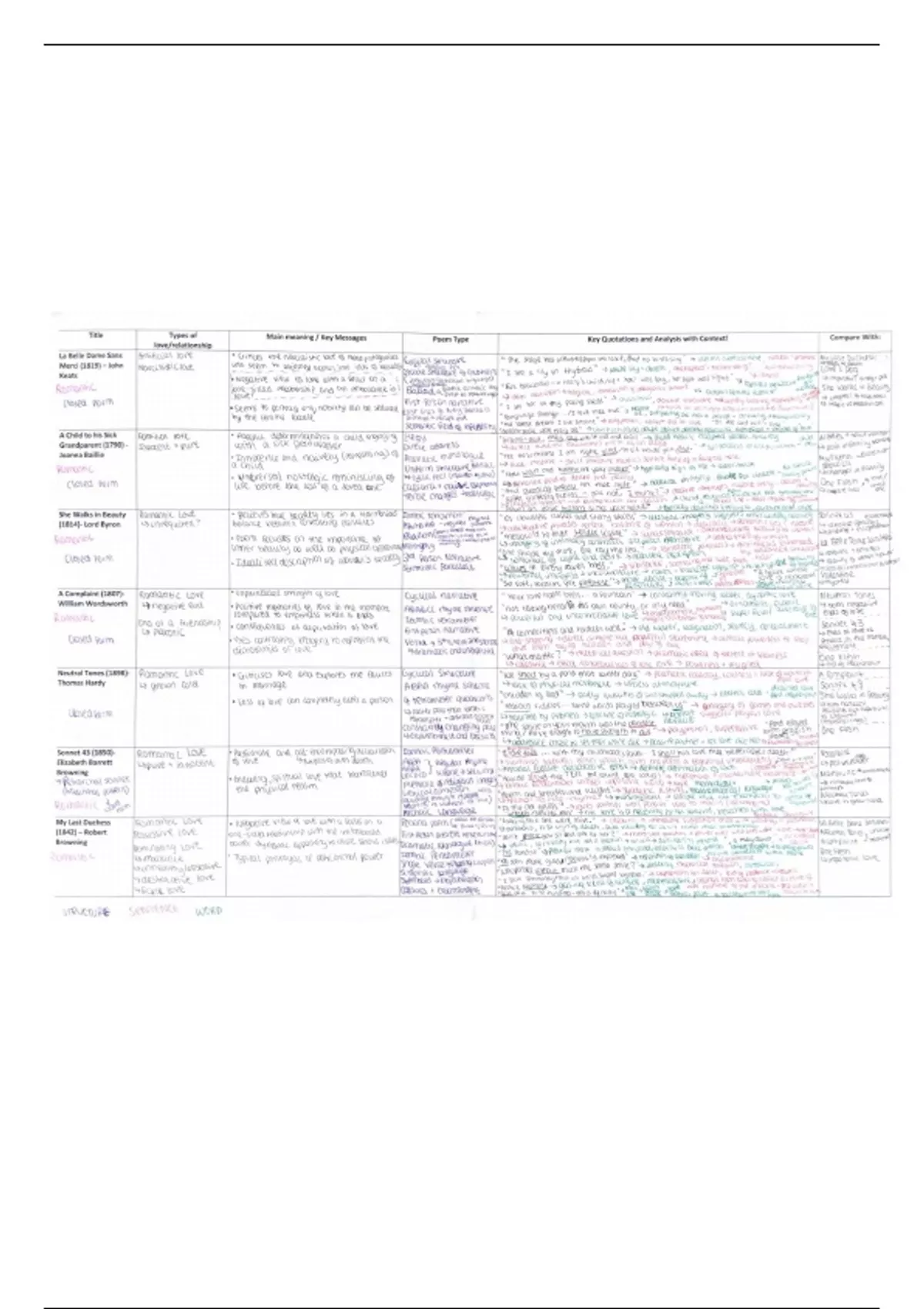In-depth analysis on each of the 15 poems in Collection A (Relationships) of the Pearson Edexcel Poetry Anthology. Includes key messages along with specific, high-level terminology relevant to each poem in a structured table layout. Structure, sentence and word analysis is included next to specific quotes with a clear colour scheme which is easy to read. Example comparisons between poems are also made. Consistently achieved Grade 9s throughout all poetry assessments and exams.