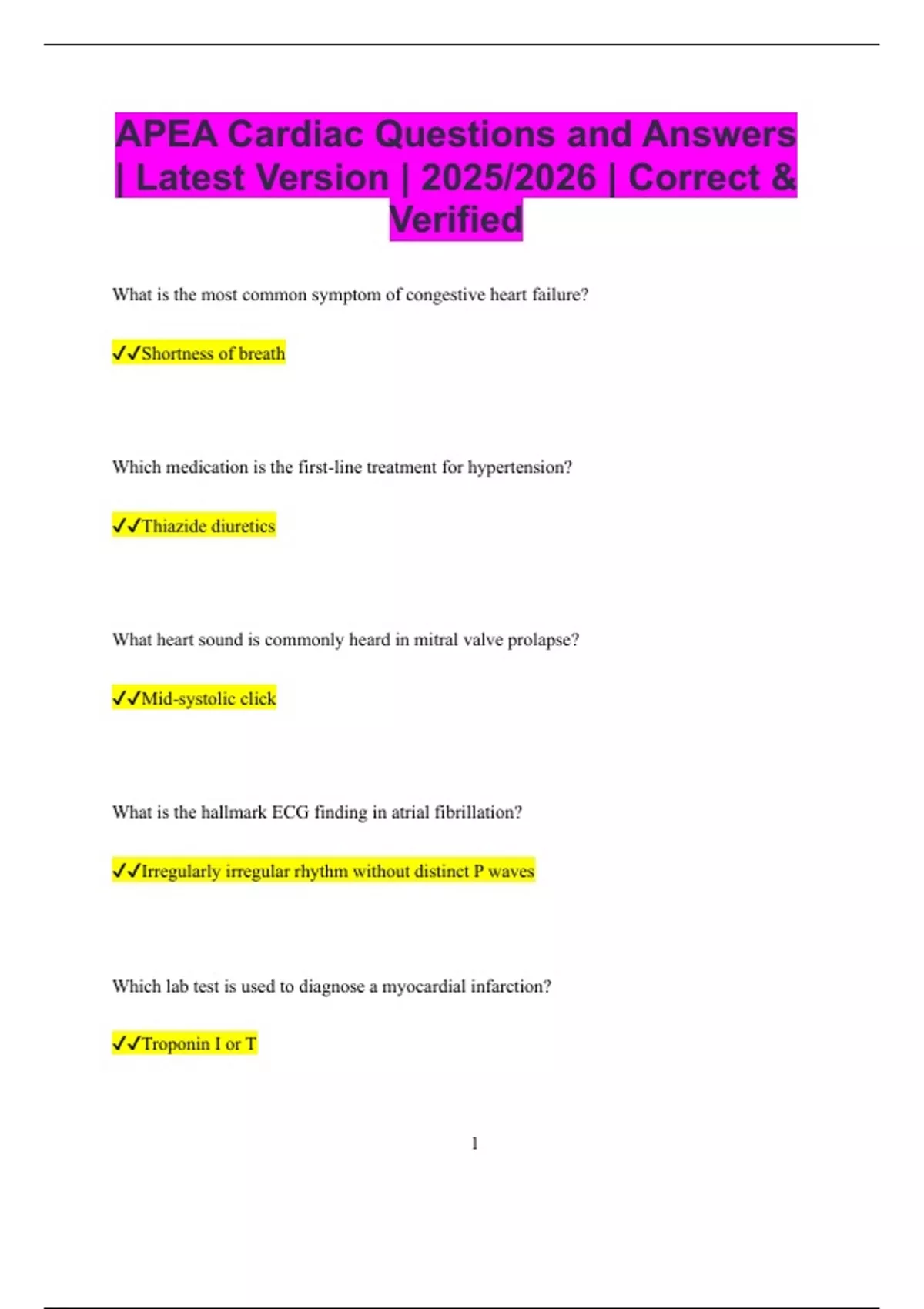 APEA Cardiac Questions and Answers | Latest Version | 2025/2026 | Correct & Verified