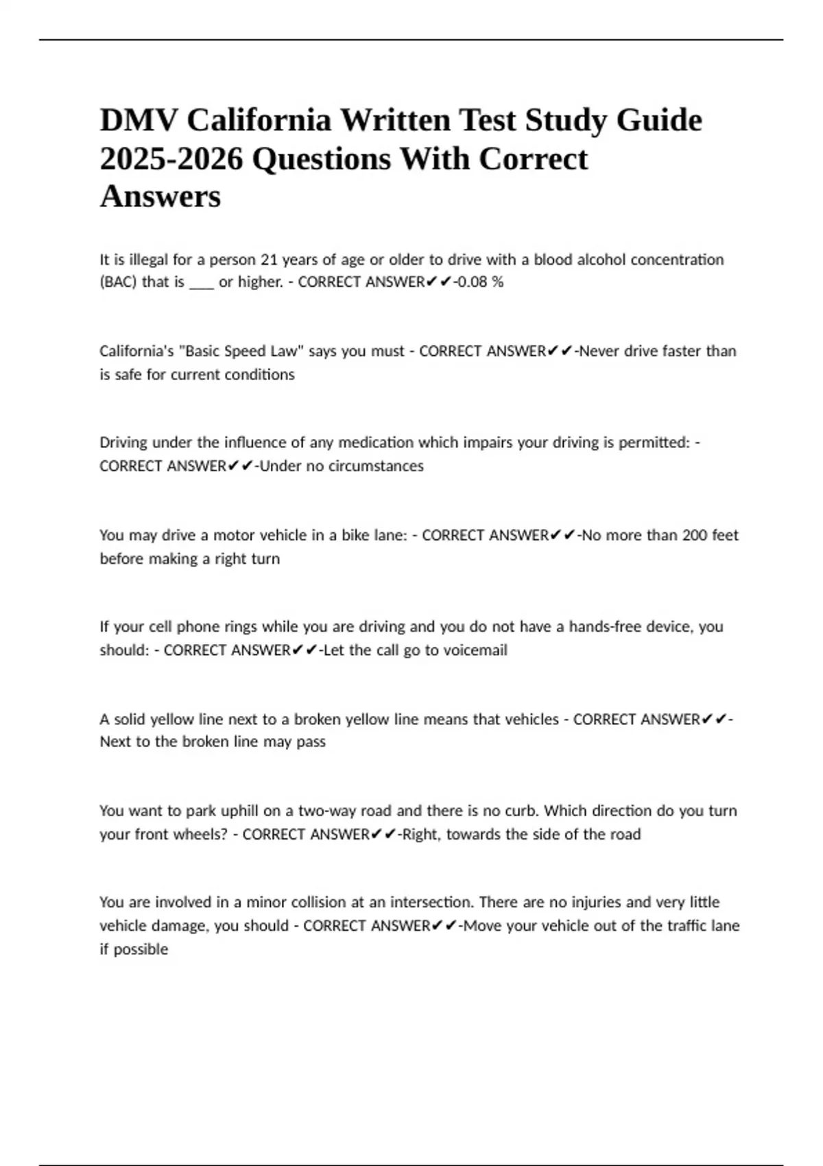 DMV California Written Test Study Guide Questions With Correct Answers.