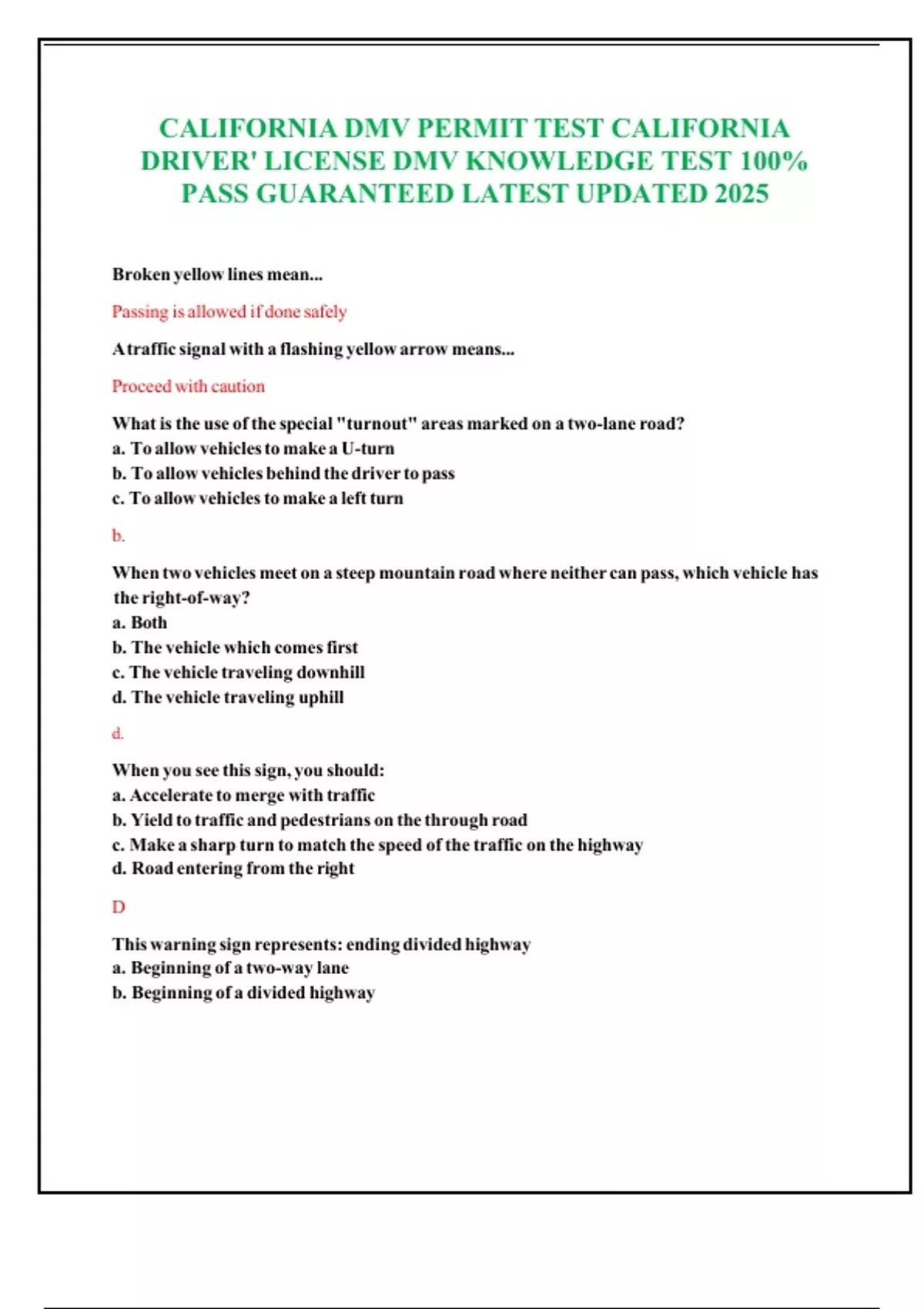 CALIFORNIA DMV PERMIT TEST CALIFORNIA DRIVER- LICENSE DMV KNOWLEDGE TEST 100- PASS GUARANTEED LATEST UPDATED 2025