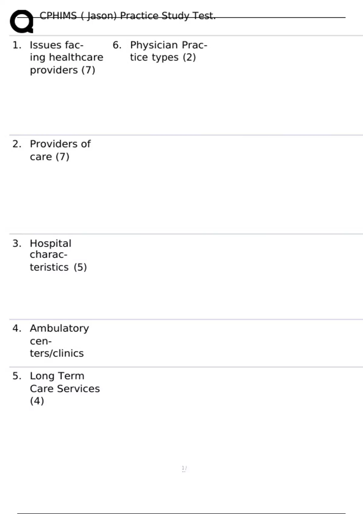 CPHIMS ( Jason) Practice Study Test. 1. Issues fac- ing healthcare providers (7) 2. Providers of care (7) 3. Hospital charac- teristics (5) 4. Ambulatory cen- ters/clinics 5. Long Term Care Services (4) 6. Physician Prac- tice types (2) -Costs Rising -Quality variations in clinical care -safety (patient) -evidence decision making -administrative process complexity -consumerish/heightened expectations -research & tech advances -Hospitals -Ambulatory centers/clinics -Long term care providers (30+ days) -Public health agencies -Community health programs -physician practices -pharmacies -Level of care provided (primary, secondary, tertiary, sub-acute) -Ownership (profit / non) -Geographic location (urban/metropolitan MSA 50k+ / rural) -Payor mix (Govt, private) -Teaching status (teaching hosp, academic med cntr, non-teaching hosp) Services withOUT overnight stay 30+ days -Nursing Home -Rehab -Mental Health -Home Health -Group practices -Solo practices 7. CPOE Computerized Practitioner Order Entry (used at pharmacies) 8. Integrated De- livery Network (IDN) 9. Key factors to IDN success (2) 10. Payment Sys- tems (2) 11. Healthcare Work- force (4) Variety of providers organized to provide a continuum of care (with integrated administration and information sharing) Formed through -Merger/Acquisition -Joint venture -Alliance -Network (e.g. virtual organization... IPA) -Physician involvement -Interoperable info systems Private Financing -private insurance -out of pocket (fee for service) Public financing -National Health Insurance System.. private providers (Canada) -National HEAlth system (Britain) govt providers Physicians -Primary care -Specialists Mid-Level practitioners -Physician Assistants -Advanced practice nurses Nurses -RNs -Nursing Informatics