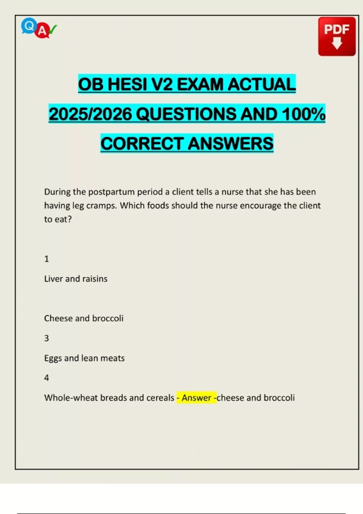 OB HESI V2 EXAM ACTUAL 2025/2026 QUESTIONS AND 100% CORRECT ANSWERS During the postpartum period a client tells a nurse that she has been having leg cramps. Which foods should the nurse encourage the client to eat? 1 Liver and raisins Cheese and broccoli 3