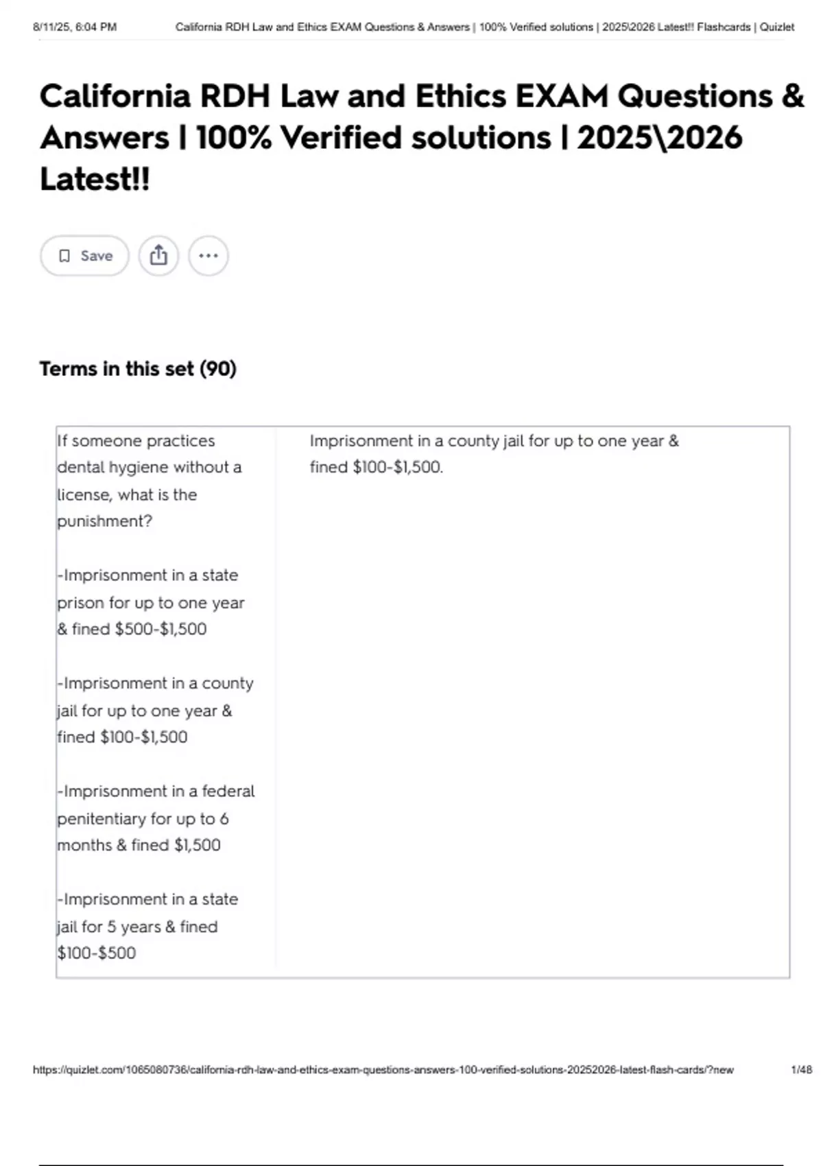 ,8/11/25, 6:04 PM California RDH Law and Ethics EXAM Questions & Answers | 100% Verified solutions | 2025\2026 Latest!! Flashcards | Quizlet