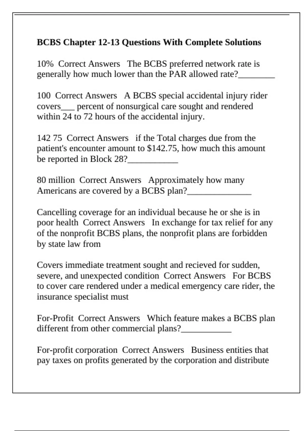100 Correct Answers A BCBS special accidental injury rider