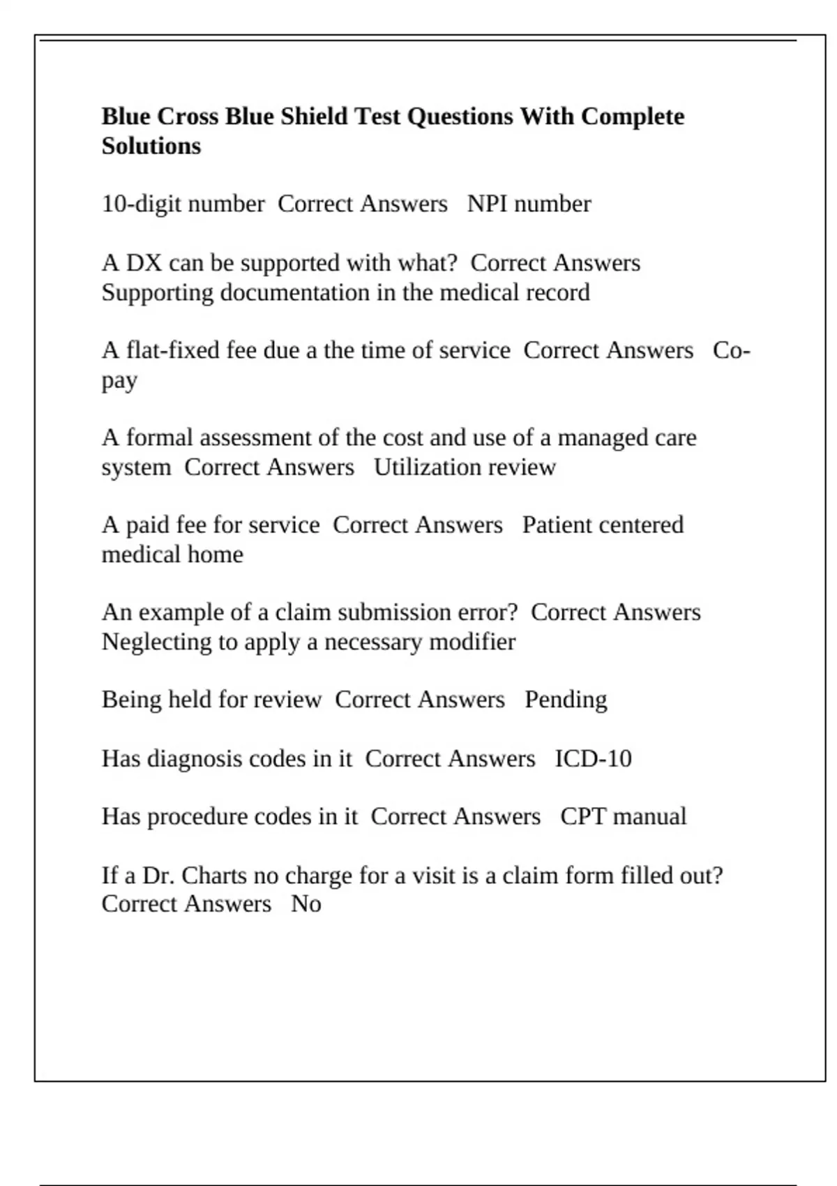 Has diagnosis codes in it Correct Answers ICD-10