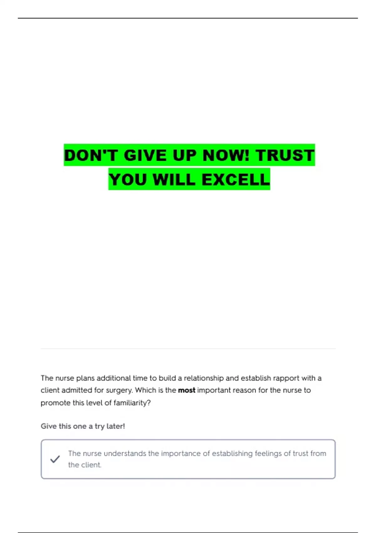 The nurse understands the importance of establishing feelings of trust from