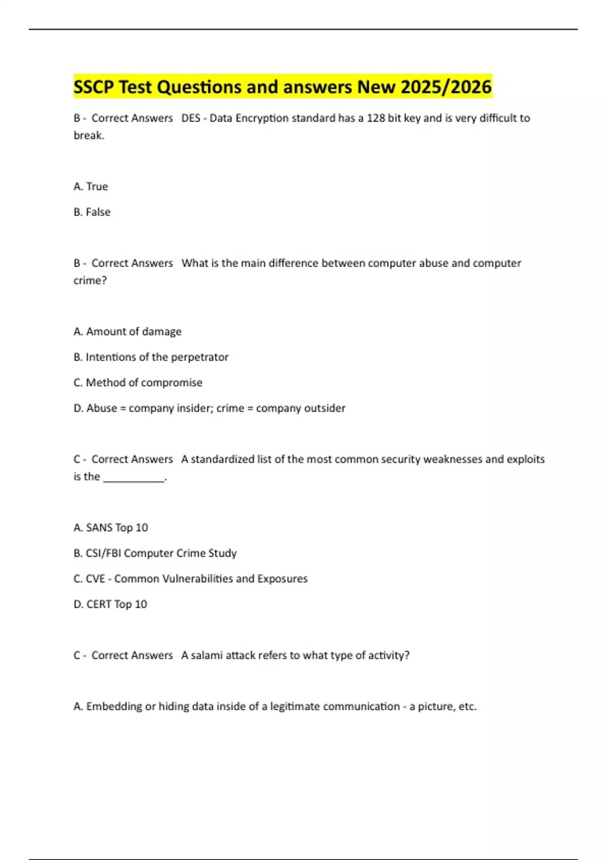 B - Correct Answers DES - Data Encryp on standard has a 128 bit key and is very difficult to