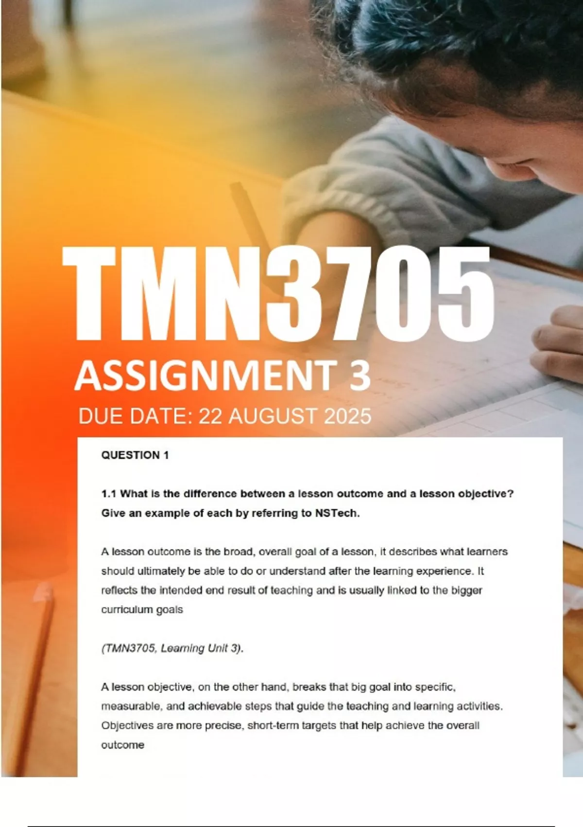 TMN3705 Assignment 3 ANSWERS 2025 - Due 22 August 2025 TMN3705 ASSIGNMENT 3 2025 DUE 22 AUGUST 2025 QUESTION 1 1.1 What is the difference between a lesson outcome and a lesson objectiveGive an example of each by referring to NSTech. A lesson outcome is the broad, overall goal of a lesson, it describes what learners should ultimately be able to do or understand after the learning experience. It reflects the intended end result of teaching and is usually linked to the bigger curriculum goals (TMN3705, Learning Unit 3). A lesson objective, on the other hand, breaks that big goal into specific, measurable, and achievable steps that guide the teaching and learning activities. Objectives are more precise, short-term targets that help achieve the overall