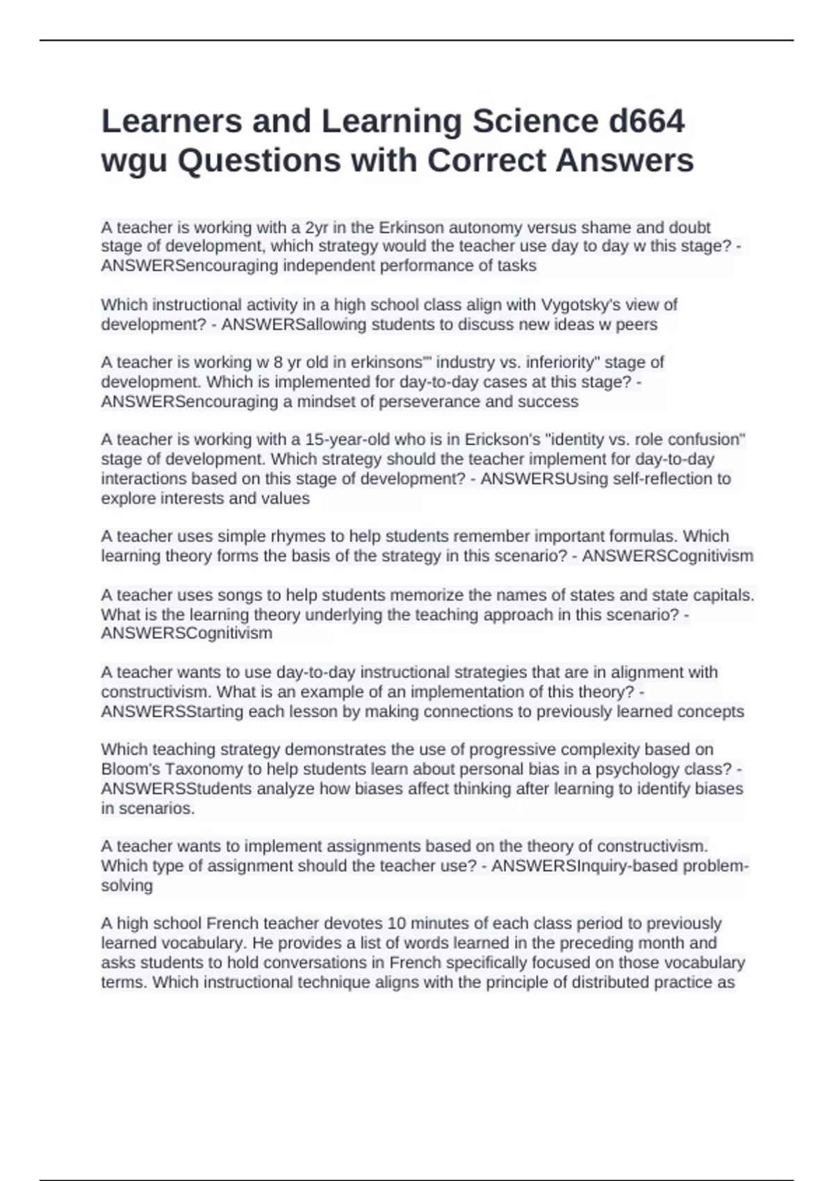 Learners and Learning Science d664 wgu Questions with Correct Answers