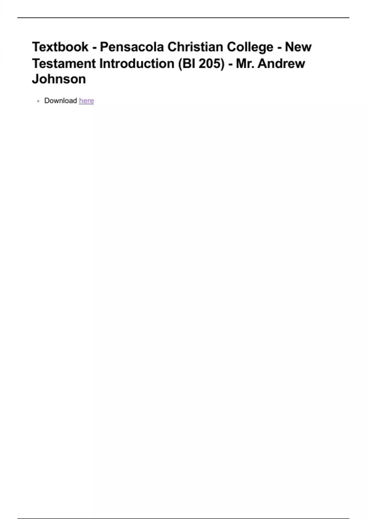 Complete textbook for New Testament Introduction (BI 205) used at Pensacola Christian College, taught by Mr. Andrew Johnson. Covers historical context, theological themes, and critical analysis of the New Testament. Ideal for students seeking a comprehensive and authoritative resource for study, assignments, and exam preparation.
