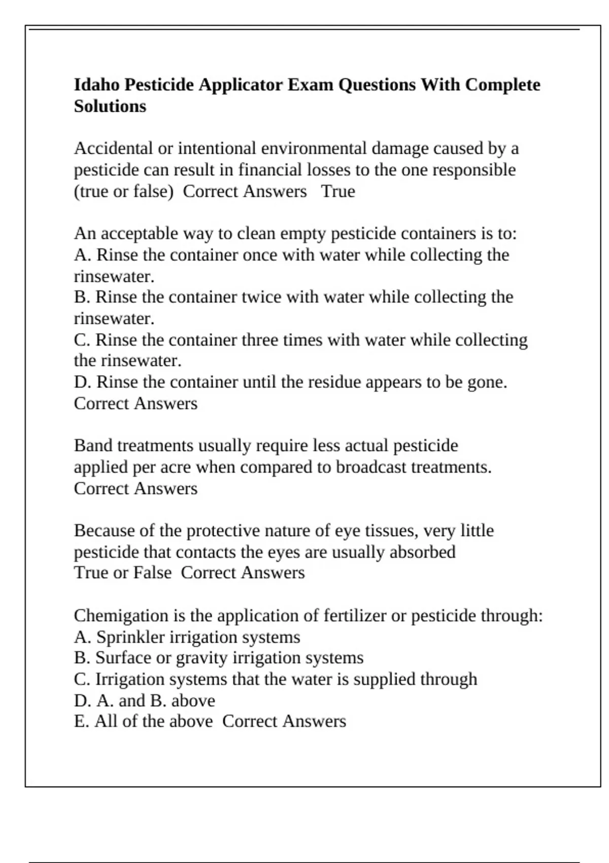 Idaho Pesticide Applicator Exam Questions With Complete Solutions