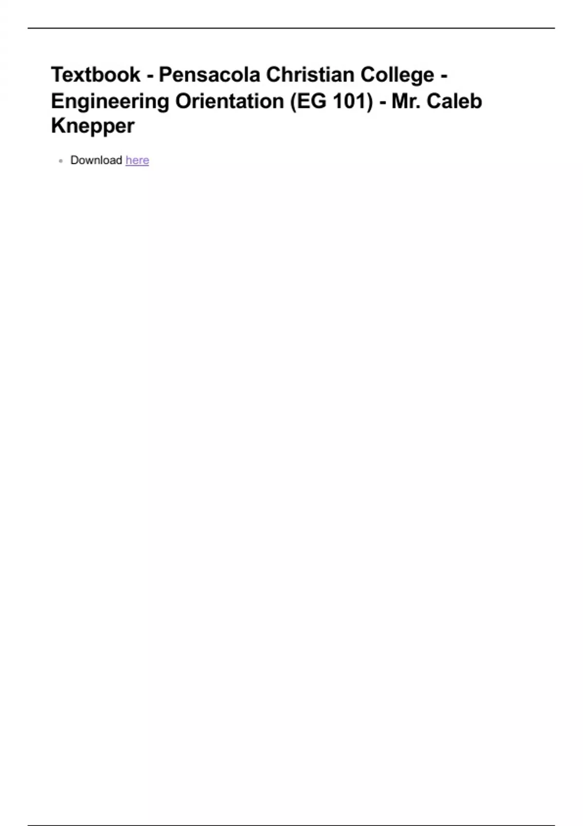 Complete textbook for Engineering Orientation (EG 101) used at Pensacola Christian College, taught by Mr. Caleb Knepper. Covers foundational engineering concepts, course structure, and essential skills for new engineering students. An excellent resource for study and course reference.
