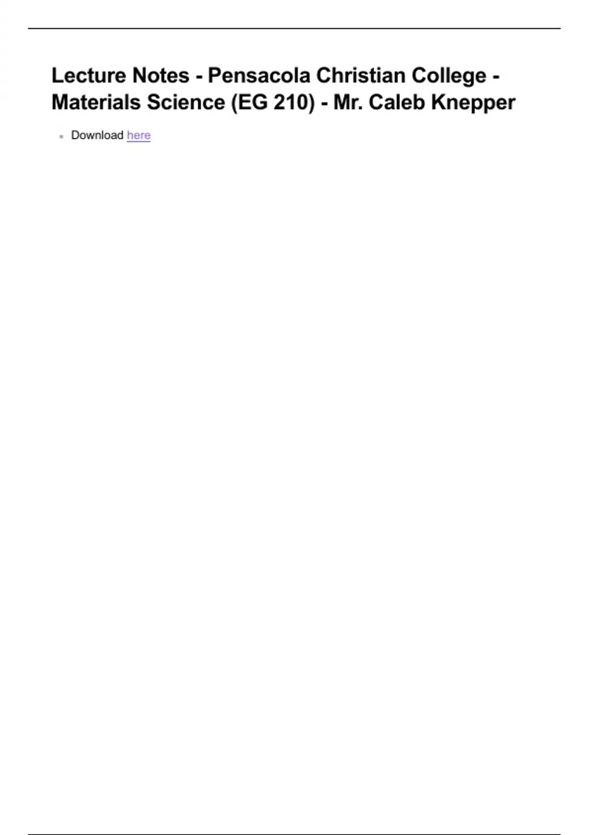 Well-organized lecture notes for Materials Science (EG 210) at Pensacola Christian College, taught by Mr. Caleb Knepper. Includes summaries of key concepts, diagrams, and study guides designed to help students grasp complex materials science topics and prepare effectively for exams.