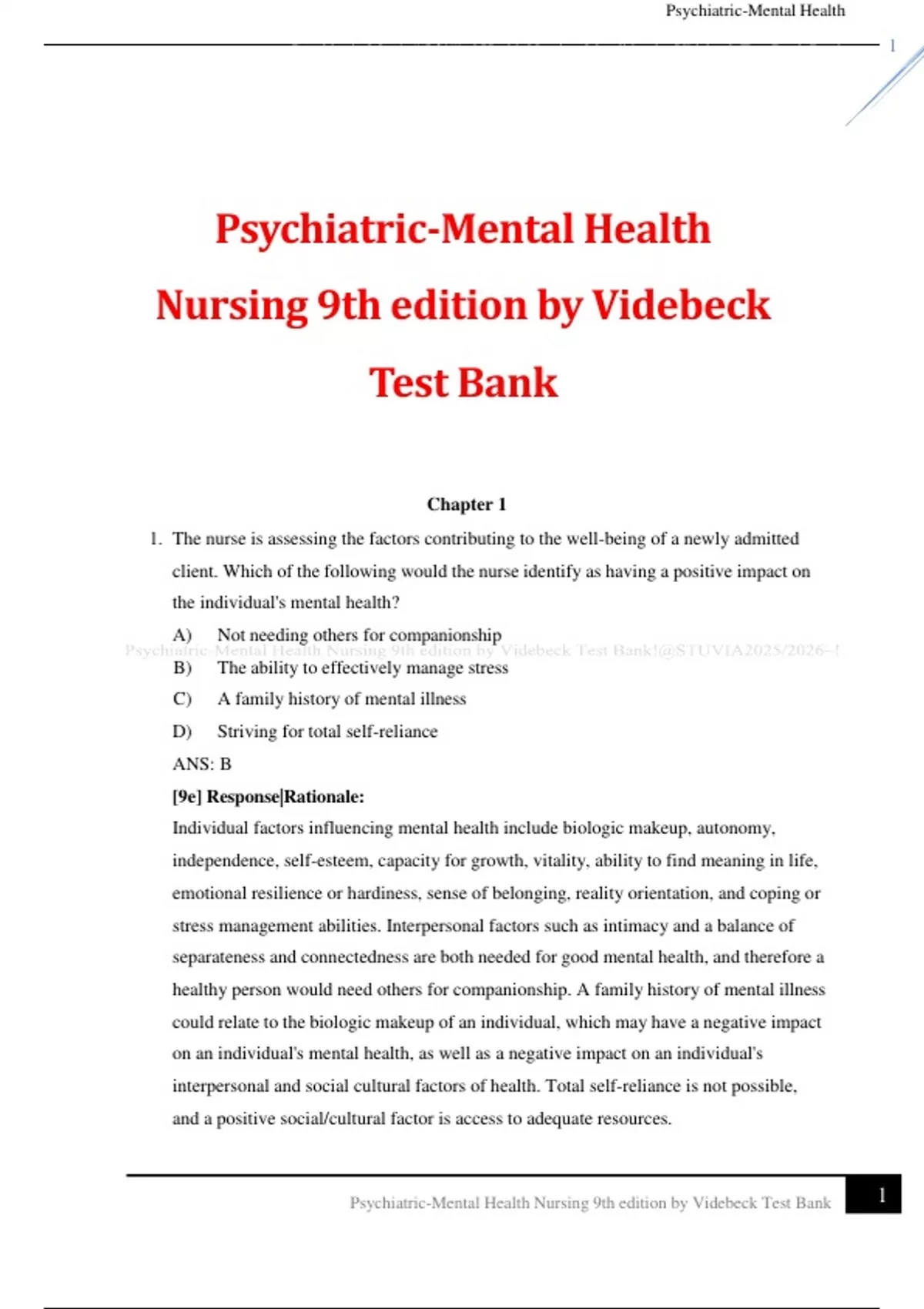, Psychiatric-Mental Health Nursing 9th edition by Videbeck Test Bank Psychiatric-Mental Health