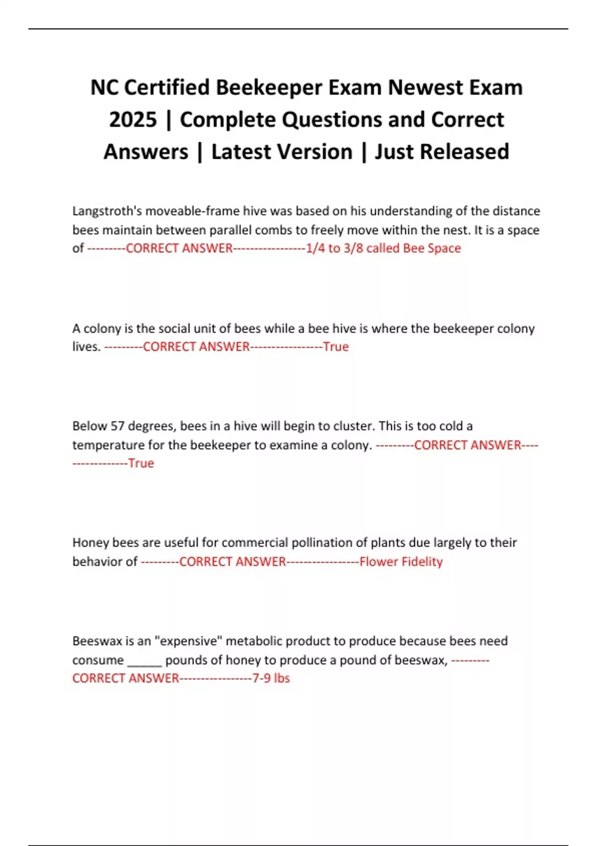 NC Certified Beekeeper Exam Newest Exam 2025 | Complete Questions and Correct Answers | Latest Version | Just Released