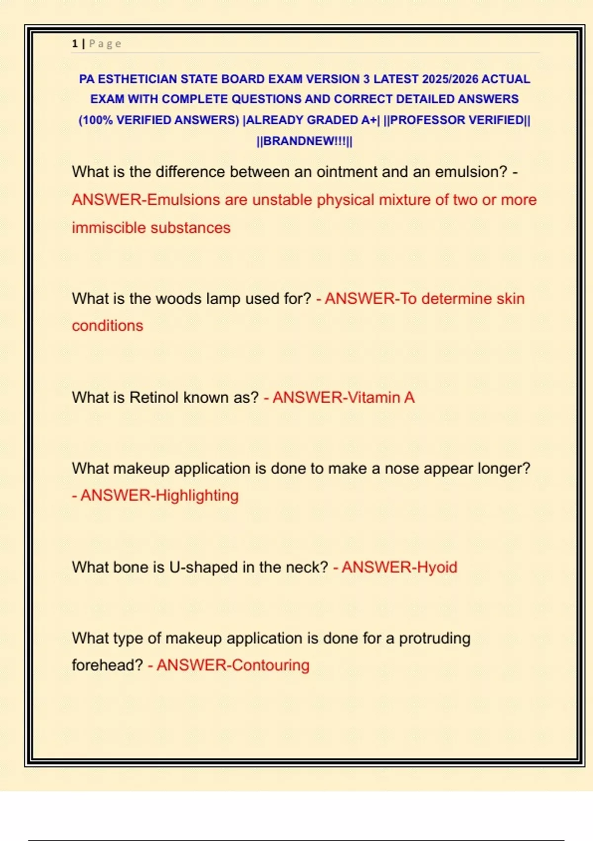 PA ESTHETICIAN STATE BOARD EXAM VERSION 3 LATEST 2025/2026 ACTUAL