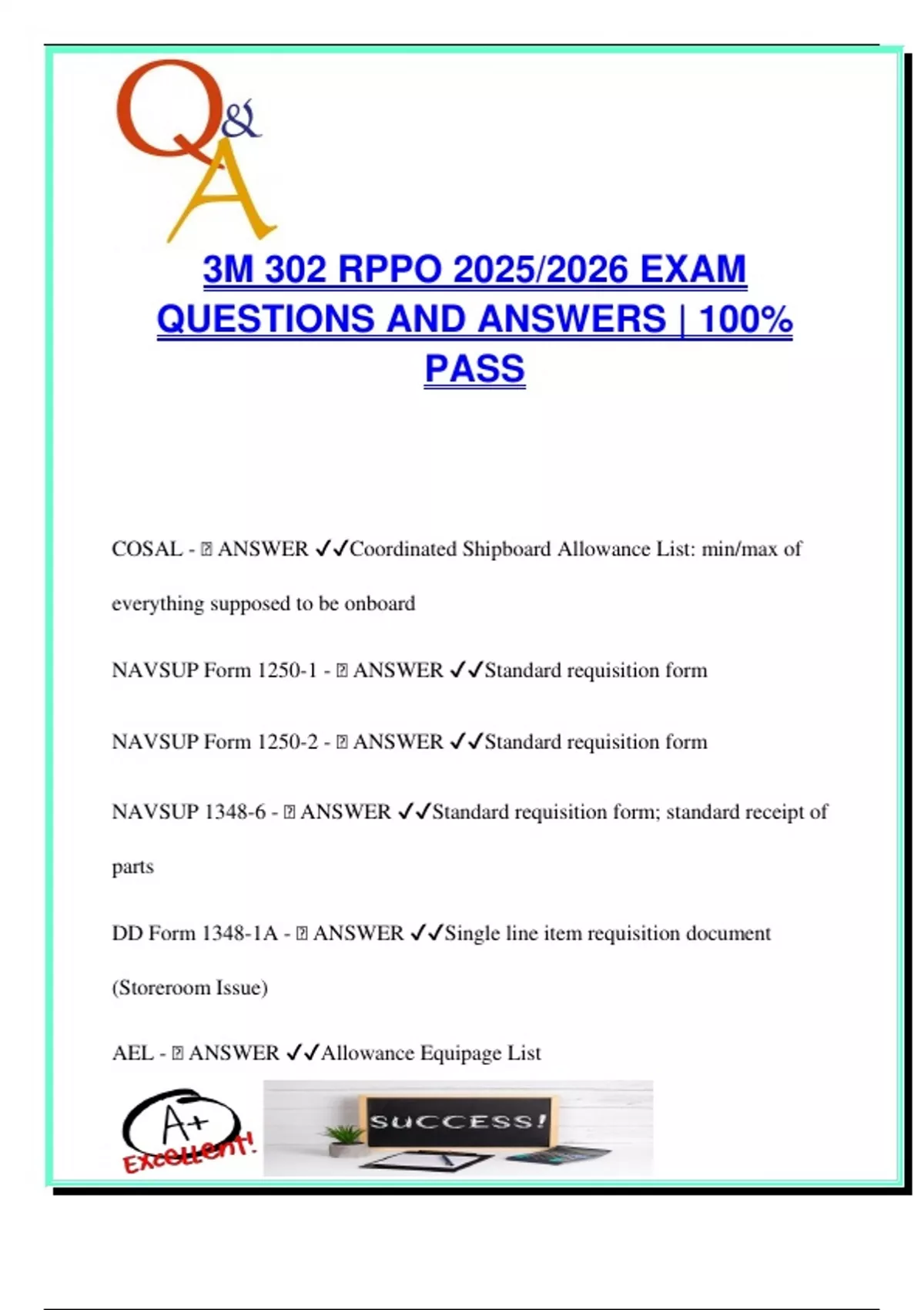This document contains 75 fully verified exam questions and answers for the 3M 302 RPPO (Repair Parts Petty Officer) qualification, updated for the 2025/2026 cycle. It covers in detail the Coordinated Shipboard Allowance List (COSAL), NAVSUP forms and procedures, National Stock Number (NSN) structure, Allowance Equipage List (AEL), Allowance Parts List (APL), and Federal Logistics Data (FEDLOG). The guide also includes essential information on hazardous materials (HAZMAT) handling, supply discrepancy reporting (SDR, QDR), government purchase procedures, operating target (OPTAR) management, depot-level repairables (DLRs), and shipboard supply chain systems such as R-Supply and HICS-WIN. The material is ideal for Navy RPPO candidates, logistics specialists, supply officers, shipboard maintenance coordinators, and maritime engineering students preparing for assessments or qualifications related to naval supply chain operations and inventory control. It is also useful for maintenance managers, technical inspectors, and logistics trainees seeking a thorough understanding of requisitioning, parts identification, and hazardous material compliance. Organized for maximum clarity, this guide ensures comprehensive coverage of abbreviations, codes, reporting procedures, and step-by-step instructions. Whether for test preparation or as an operational reference, it provides the accuracy and detail needed to excel in RPPO duties. Keywords: COSAL, NAVSUP forms, NSN, AEL, APL, FEDLOG, OPTAR, FCFBR, GPC, NAVSUP P-485, NAVSUP P-409, SF 368, SF 364, ACR, CAGE, FSCM, HMIS, HMUG, SMR codes, MTR, MILSTRIP, MILSTRAP, DLR, HAZMAT, MSDS, FLIPL, DTO, MAM, R-Supply, HICS-WIN