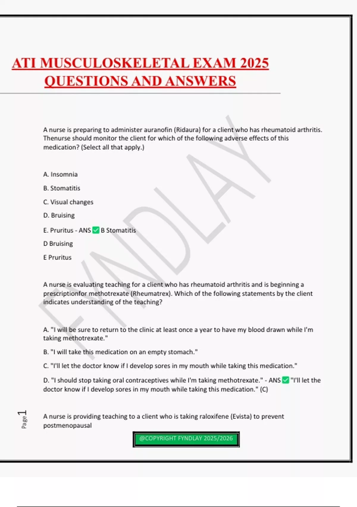 A nurse is preparing to administer auranofin (Ridaura) for a client who has rheumatoid arthritis. Thenurse should monitor the client for which of the following adverse effects of this medication? (Select all that apply.) A. Insomnia B. Stomatitis C. Visual changes D. Bruising E. Pruritus - ANS B Stomatitis D Bruising E Pruritus A nurse is evaluating teaching for a client who has rheumatoid arthritis and is beginning a prescriptionfor methotrexate (Rheumatrex). Which of the following statements by the client indicates understanding of the teaching? A. "I will be sure to return to the clinic at least once a year to have my blood drawn while I'm taking methotrexate." B. "I will take this medication on an empty stomach." C. "I'll let the doctor know if I develop sores in my mouth while taking this medication." D. "I should stop taking oral contraceptives while I'm taking methotrexate." - ANS "I'll let the doctor know if I develop sores in my mouth while taking this medication." (C) A nurse is providing teaching to a client who is taking raloxifene (Evista) to prevent postmenopausal ATI MUSCULOSKELETAL EXAM 2025 QUESTIONS AND ANSWERS @COPYRIGHT FYNDLAY 2025/2026 Page2 osteoporosis. The nurse should advise the client that which of the following are adverse effects of this medication? (Select all that apply.) A. Hot flashes B. Lump in breast C. Swelling or redness in calf D. Shortness of breath E. Difficulty swallowing - ANS A, C, D. (Hot flashes, calf redness/swelling, SOB.) A client who has osteoporosis has a new prescription for alendronate (Fosamax). Which of the following instructions should the nurse provide for the client? (Select all that apply.) A. Take medication in the morning before eating. B. Chew tablets to increase bioavailability. C. Drink a full glass of water with each tablet. D. Take Fosamax with an antacid if heartburn occurs. E. Avoid lying down after taking this medication. - ANS A, C, E. (Meds before eating, glass of water, avoid lying down.) A nurse is caring for a client who has a new prescription for calcitonin-salmon for osteoporosis. Which of the following tests should the nurse tell the client to expect before beginning this medication? A. Skin test for allergy to the medication B. ECG to rule out cardiac dysrhythmias C. Mantoux test to rule out exposure to tuberculosis D. Liver function tests to assess risk for medication toxicity - ANS @COPYRIGHT FYNDLAY 2025/2026 Page3 A nurse is caring for a young adult client whose serum calcium is 8.8 mg/dL. Which of the following medications should the nurse anticipate administering to this client? A. Calcitonin-salmon (Miacalcin) B. Calcium carbonate (Tums) C. Zoledronic (Reclast) D. Ibandronate (Boniva) - ANS B. Calcium carbonate (Tums) A nurse is providing instruction to a client who has a new prescription for calcitonin-salmon (Miacalcin) for postmenopausal osteoporosis. Which of the following should the nurse teach the client regarding self-administration of this medication? A. Swallow tablets on an empty stomach with plenty of water. B. Watch for skin rash and redness when applying calcitonin-salmon topically. C. Mix the liquid medication with juice and take it after meals. D. Alternate nostrils each time calcitonin-salmon is inhaled. - ANS D. (Alternate nostrils each time calcitonin-salmon is inhaled.) An obese client with degenerative joint disease is being managed with aspirin therapy. The nurse determines that additional teaching is needed when which client statement is made? a "I use heat sometimes to help reduce my pain and stiffness." b "I frequently examine my stools for bleeding." c "I take my aspirin when I have extreme pain or stiffness." d "I started an exercise program to lose weight." - ANS ANSWER C Rationale: Aspirin therapy is continuous and is effective only if therapeutic blood levels are reached. It is not taken intermittently. The other statements are appropriate self-care measures when taking aspirin for osteoarthritis. Non-pharm