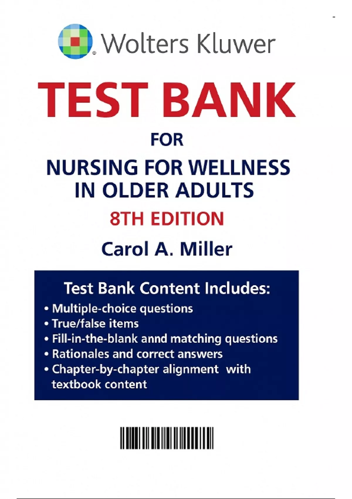Test Bank For Nursing for Wellness in Older Adults 8th Edition by Carol A. Miller 8287, 2 , 8300, 4 1 Seeing Older Adults Through the Eyes of Wellness 2 Addressing Diversity of Older Adults 3 Applying a Nursing Model for Promoting Wellness in Older Adults 4 Theoretical Perspectives on Aging Well 5 Gerontological Nursing and Health Promotion 6 Health Care for Older Adults in Various Settings 7 Assessment of Health and Functioning 8 Medications and Other Bioactive Substances 9 Legal and Ethical Concerns 10 Elder Abuse and Neglect 11 Cognitive Wellness 12 Psychosocial Wellness 13 Psychosocial Assessment 14 Impaired Cognitive Function: Delirium and Dementia 15 Impaired Affective Function: Depression 16 Hearing 17 Vision 18 Digestion and Nutrition 20 Cardiovascular Function 21 Respiratory Function 22 Safe Mobility 23 Integumentary Function 24 Sleep and Rest 25 Thermoregulation 26 Sexual Function 27 Caring for Older Adults During Illness 28 Caring for Older Adults Experiencing Pain 29 Caring for Older Adults at the End of Life