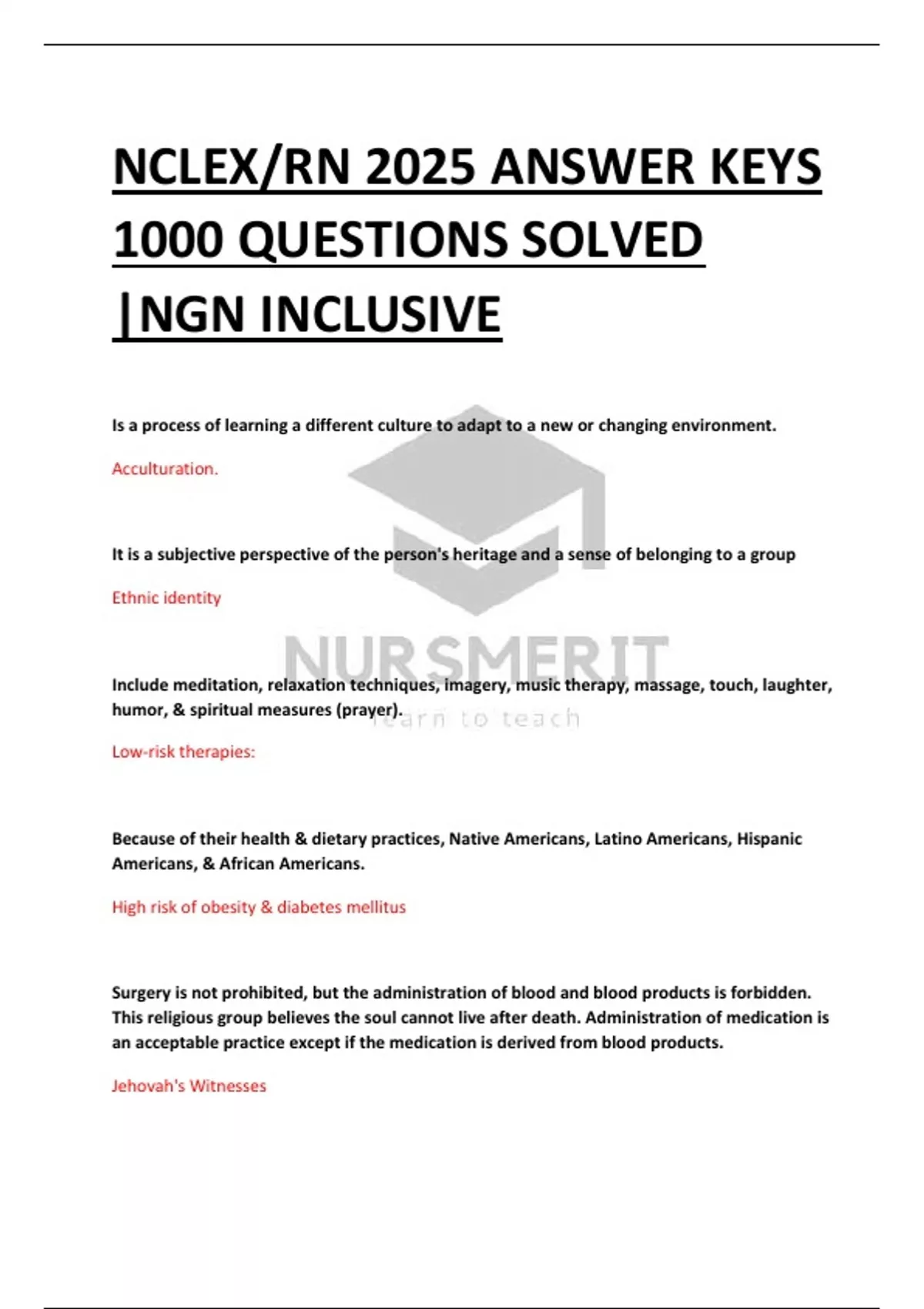 NCLEX/RN 2025 ANSWER KEYS 1000 QUESTIONS SOLVED |NGN INCLUSIVE