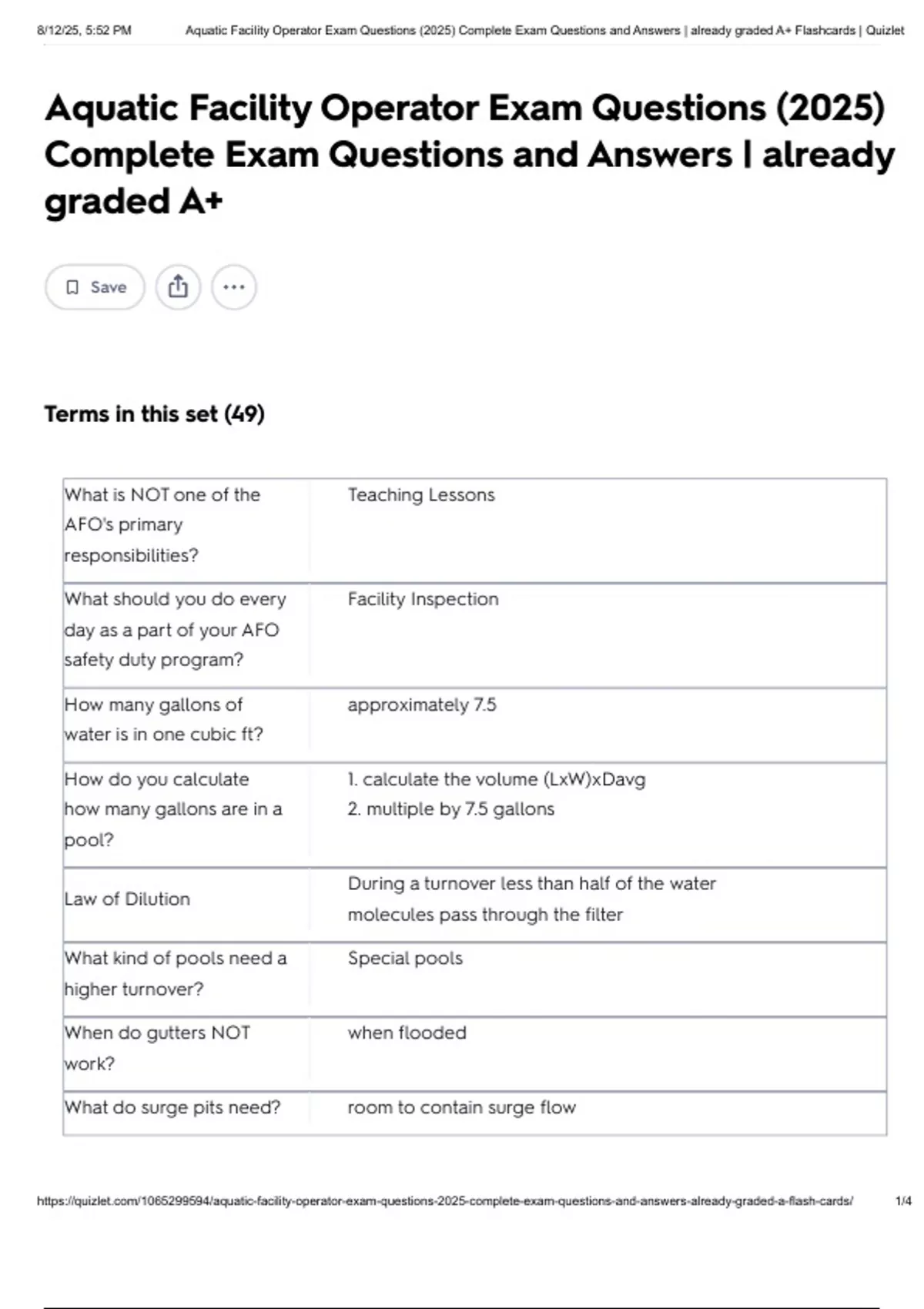 8/12/25, 5:52 PM Aquatic Facility Operator Exam Questions (2025) Complete Exam Questions and Answers | already graded A+ Flashcards | Quizlet