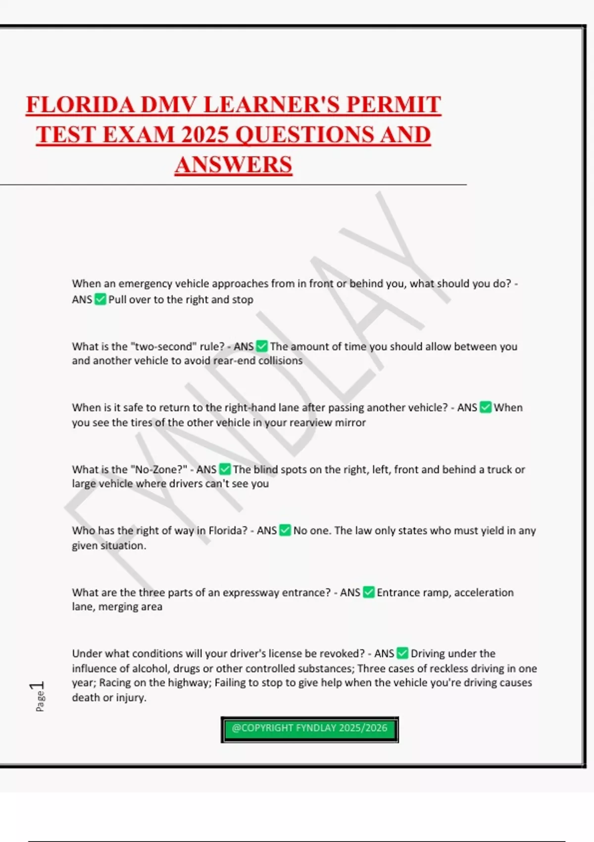 FLORIDA DMV LEARNER'S PERMIT TEST EXAM 2025 QUESTIONS AND ANSWERS