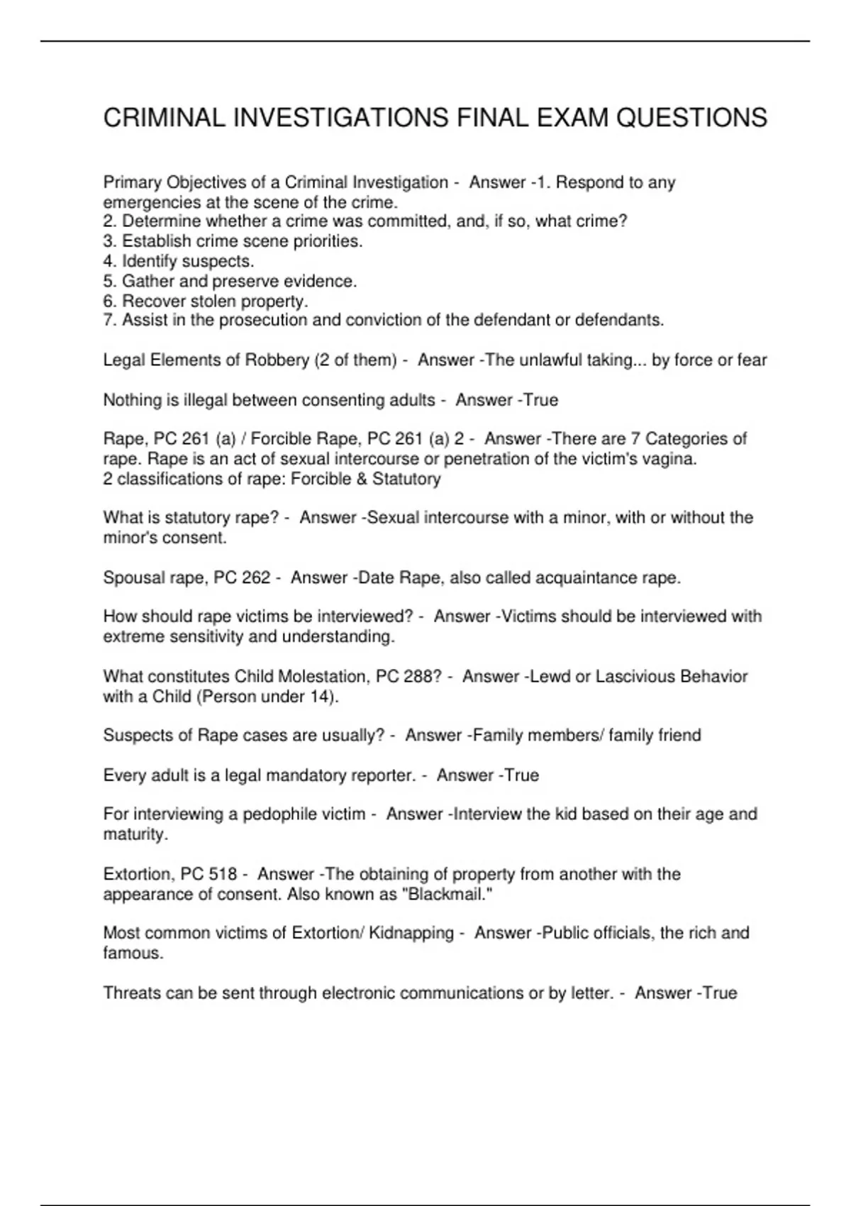 What is statutory rape? - Answer -Sexual intercourse with a minor, with or without the