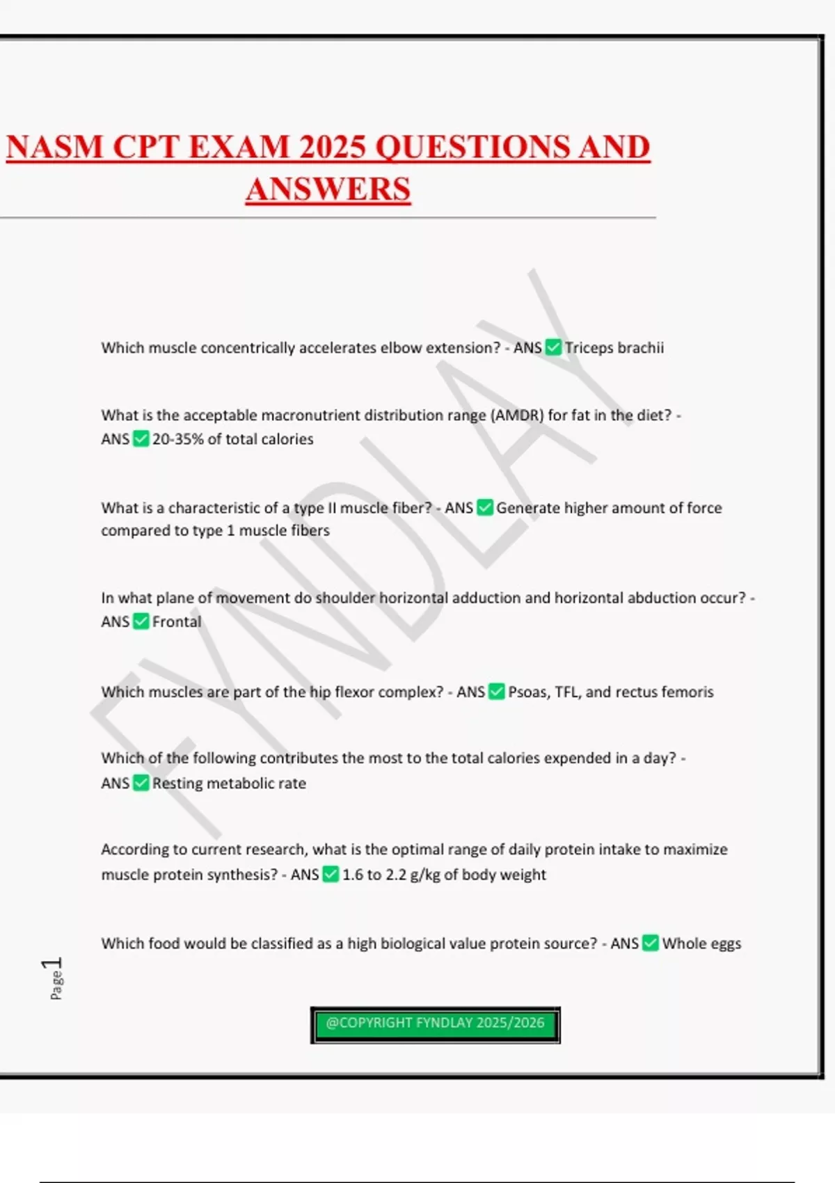 Which muscle concentrically accelerates elbow extension? - ANS Triceps brachii What is the acceptable macronutrient distribution range (AMDR) for fat in the diet? - ANS 20-35% of total calories What is a characteristic of a type II muscle fiber? - ANS Generate higher amount of force compared to type 1 muscle fibers In what plane of movement do shoulder horizontal adduction and horizontal abduction occur? - ANS Frontal Which muscles are part of the hip flexor complex? - ANS Psoas, TFL, and rectus femoris Which of the following contributes the most to the total calories expended in a day? - ANS Resting metabolic rate According to current research, what is the optimal range of daily protein intake to maximize muscle protein synthesis? - ANS 1.6 to 2.2 g/kg of body weight Which food would be classified as a high biological value protein source? - ANS Whole eggs NASM CPT EXAM 2025 QUESTIONS AND ANSWERS @COPYRIGHT FYNDLAY 2025/2026 Page2 A new client has indicated that they are exercising due to advice from their physician, but they are generally amotivated. What would be the best choice for the personal trainer in their initial meeting? - ANS Inquire further about what their motives are for participating. Extrinsic motivation is characterized by which of the following? - ANS Participating in an activity or behavior for some type of reward or recognition from others Research has demonstrated that moderate-intensity exercise is best for which of the following? - ANS Providing psychological benefits Which barrier to exercise is most likely to be associated with body image issues? - ANS Social physique anxiety Not having someone to exercise with would be an example of which type of barrier to exercise? - ANS Lack of social support Which of the following would be considered a process goal? - ANS Run three times a week What type of communication includes posture, hand, gestures, proximity to others, and facial expressions? - ANS Nonverbal communication At which stage of change are self-efficacy levels generally the highest? - ANS Maintenance A new client tells their personal trainer that although he exercises occasionally, he is now ready to try a different approach to become a regular exerciser. This is an example of which section of the stage of change mod