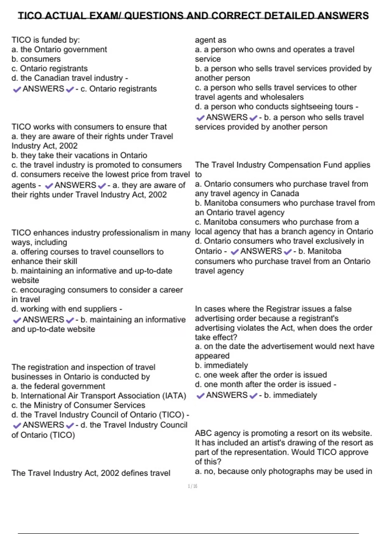 ANSWERS - c. Ontario registrants c. a person who sells travel services to other