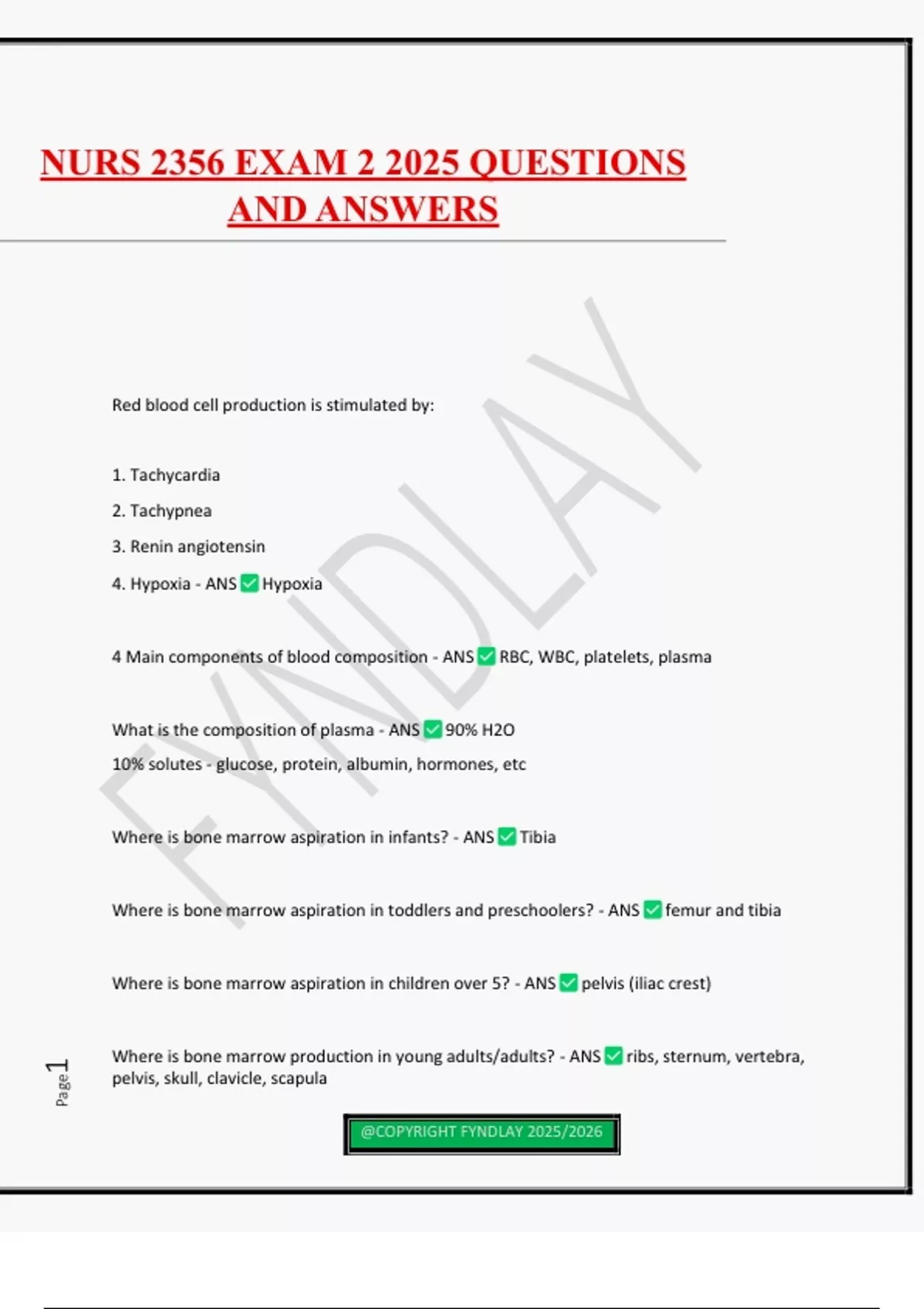 Red blood cell production is stimulated by: 1. Tachycardia 2. Tachypnea 3. Renin angiotensin 4. Hypoxia - ANS Hypoxia 4 Main components of blood composition - ANS RBC, WBC, platelets, plasma What is the composition of plasma - ANS 90% H2O 10% solutes - glucose, protein, albumin, hormones, etc Where is bone marrow aspiration in infants? - ANS Tibia Where is bone marrow aspiration in toddlers and preschoolers? - ANS femur and tibia Where is bone marrow aspiration in children over 5? - ANS pelvis (iliac crest) Where is bone marrow production in young adults/adults? - ANS ribs, sternum, vertebra, pelvis, skull, clavicle, scapula NURS 2356 EXAM 2 2025 QUESTIONS AND ANSWERS @COPYRIGHT FYNDLAY 2025/2026 Page2 what is anemia - ANS a condition in which levels of red blood cells and hemoglobin are lower than normal 4 types of anemia - ANS Iron deficiency lead poisoning sickle cell B-thalassemia Define iron deficiency anemia - ANS reduction in the iron stores of the body causing an inadequate production of hemoglobin What is iron needed for? - ANS to make hgb signs and symptoms of iron deficiency anemia - ANS pallor tachycardia tachypnea lethargy fatigue irritability Why are neonates at risk for iron deficiency anemia? - ANS -lack the maternal iron stores -Full term infants have maternal iron stores until approximately 6 months of age -Havent had the time in utero to store up the needed iron supply (preterm) How can you treat a neonate with iron deficiency anemia? - ANS Iron fortified formula What are risk factors for iron deficiency anemia in infants and children? - ANS quate iron intake @COPYRIGHT FYNDLAY 2025/2026 Page3 2.Malabsorption of iron in GI tract 3.Chronic blood loss Food with good sources of iron - ANS red meat, egg yolk, leafy greens, dried fruits, fortified cereals/formulas, beef, chicken, fish, beans, nuts, seeds, peanut butter, eggs, prunes, whole grain bread How is iron deficiency anemia diagnosed? - ANS Serum lab evaluation: -Red blood cell count = microcytic (small) and hypo chronic (pale in color) -low hemoglobin -low hematocrit -low reticulocyte count -low serum iron concentration -high total iron binding capacity What is the goal of treatment for iron deficiency anemia - ANS treat medical problem causing malabsorption or blood loss/ identify cause What is the treatment method for iron deficiency anemia? - ANS Increase iron take ~ Dietary sources ~Medication supplement (ferrosol or ferrous sulfate) What should nurses and parents know about administering iron to children? - ANS - Administer to back of
