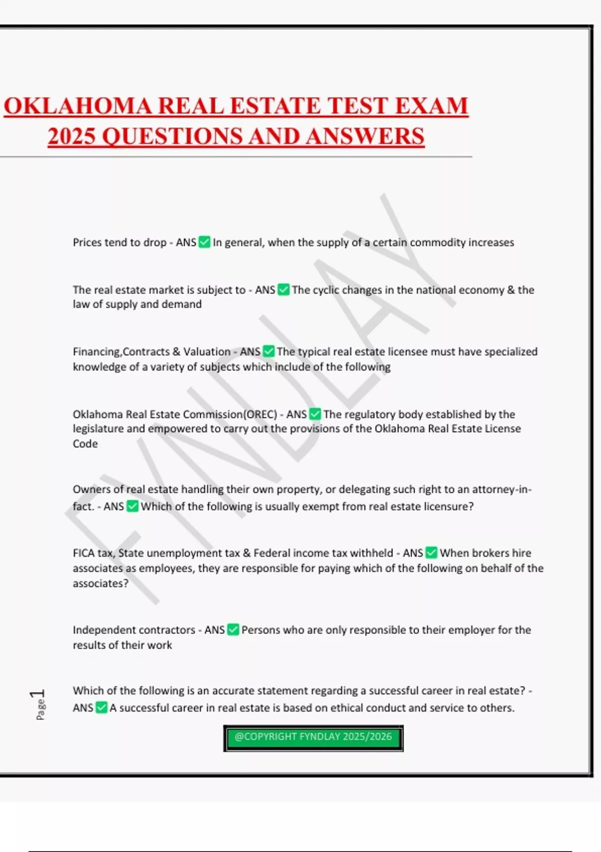 Prices tend to drop - ANS In general, when the supply of a certain commodity increases The real estate market is subject to - ANS The cyclic changes in the national economy & the law of supply and demand Financing,Contracts & Valuation - ANS The typical real estate licensee must have specialized knowledge of a variety of subjects which include of the following Oklahoma Real Estate Commission(OREC) - ANS The regulatory body established by the legislature and empowered to carry out the provisions of the Oklahoma Real Estate License Code Owners of real estate handling their own property, or delegating such right to an attorney-in- fact. - ANS Which of the following is usually exempt from real estate licensure? FICA tax, State unemployment tax & Federal income tax withheld - ANS When brokers hire associates as employees, they are responsible for paying which of the following on behalf of the associates? Independent contractors - ANS Persons who are only responsible to their employer for the results of their work Which of the following is an accurate statement regarding a successful career in real estate? - ANS A successful career in real estate is based on ethical conduct and service to others. OKLAHOMA REAL ESTATE TEST EXAM 2025 QUESTIONS AND ANSWERS @COPYRIGHT FYNDLAY 2025/2026 Page2 A successful career in real estate is based on knowledge of a great variety of subjects. Clients - ANS The NAR Code of Ethics reflects the relations of the licensee to public, licensee to fellow brokers and licensee to only members of NAR - ANS The term REALTOR is a registered trademark term and can be used by ARELLO - ANS Association of Real Estate License Law Officials Home sales - ANS The largest number of licensed people in the real estate industry are in involved in Tenant relations, maintenance of property, negotiations - ANS Property managers must be skilled in Insurance - ANS In Oklahoma, appraisers are licensed or certified by the Appraisal Board, administered under the Oklahoma Department of Local Governments - ANS Urban planners usually have an appropriate degree and employed by Manage property belonging to another & sell property belonging to another - ANS Which is usually not exempt from real estate licensure? Commission splits - ANS May vary after meeting certain production goals Administrative Law - ANS Which specialized type of law sets forth the ground rules by which the Commission must function to ensure orderly procedures and equal treatment for all. @COPYRIGHT FYNDLAY 2025/2026 Page3 Sell their computer testing system to other states - ANS The OREC has the power to 4 - ANS How many years are the Oklahoma Real Estate Commissioners appointed to serve? Primarily African Americans & Minority real estate licensees - ANS The National Association of Real Estate Brokers was established in 1947 (NAREB). Its members are REALTISTS The main emphasis of ARELLO is the - ANS Exchange of information, exchange of ideas regarding licensing, regulation and adoption of similar policies and standards for all states. CCIM - ANS Which association provides in-depth courses for persons interested in learning about commercial real estate? 70% - ANS In the United States, about what percentage of the population lives within one hundred miles of a coastal line? Types of mortgages available, interest rates, closing dates - ANS For the individual, what factors would weigh heavily in determining an offer price? A parcel of real property may include - ANS Land and improvements. mineral rights, trees,houses and septi
