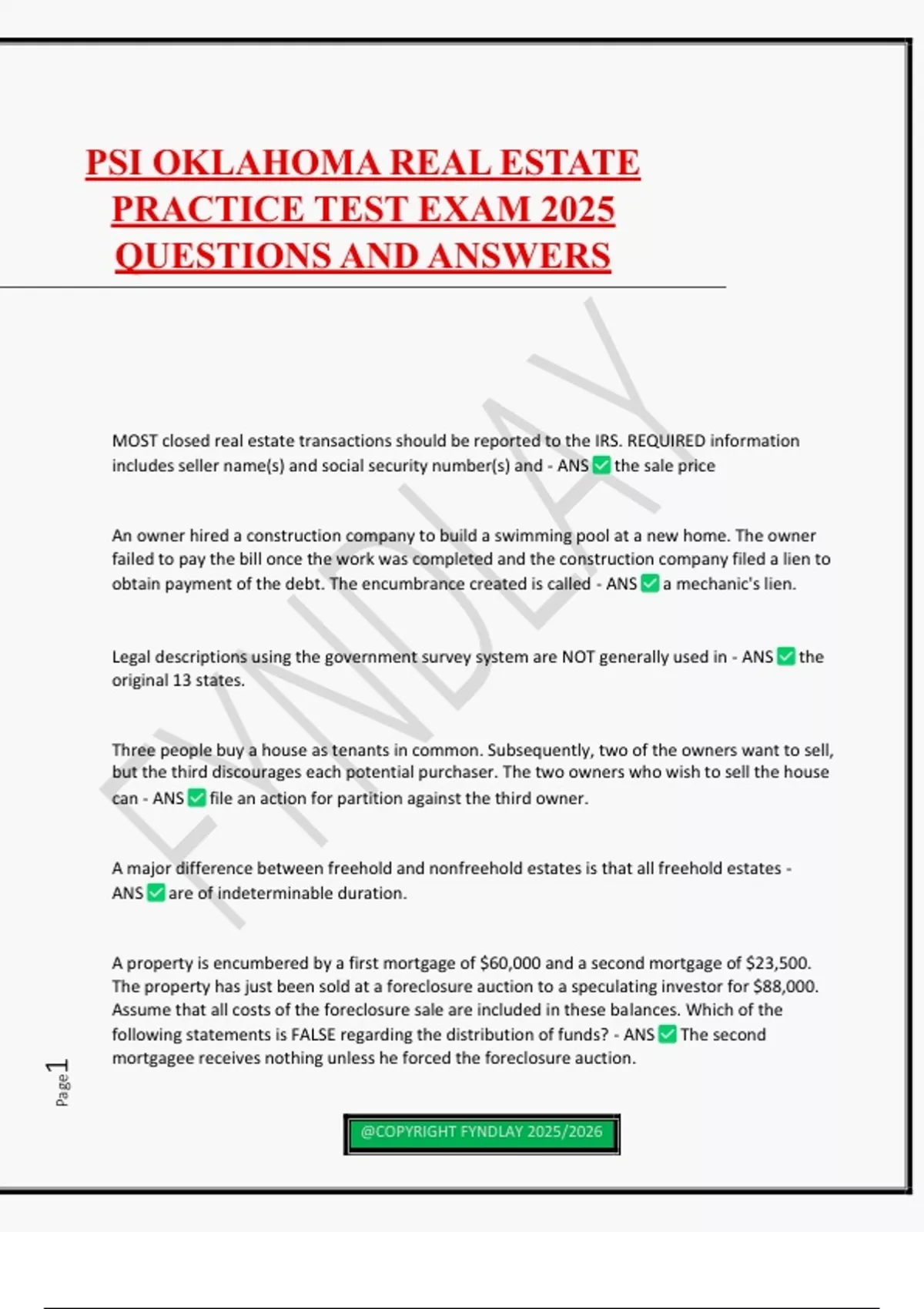 MOST closed real estate transactions should be reported to the IRS. REQUIRED information includes seller name(s) and social security number(s) and - ANS the sale price An owner hired a construction company to build a swimming pool at a new home. The owner failed to pay the bill once the work was completed and the construction company filed a lien to obtain payment of the debt. The encumbrance created is called - ANS a mechanic's lien. Legal descriptions using the government survey system are NOT generally used in - ANS the original 13 states. Three people buy a house as tenants in common. Subsequently, two of the owners want to sell, but the third discourages each potential purchaser. The two owners who wish to sell the house can - ANS file an action for partition against the third owner. A major difference between freehold and nonfreehold estates is that all freehold estates - ANS are of indeterminable duration. A property is encumbered by a first mortgage of $60,000 and a second mortgage of $23,500. The property has just been sold at a foreclosure auction to a speculating investor for $88,000. Assume that all costs of the foreclosure sale are included in these balances. Which of the following statements is FALSE regarding the distribution of funds? - ANS The second mortgagee receives nothing unless he forced the foreclosure auction. PSI OKLAHOMA REAL ESTATE PRACTICE TEST EXAM 2025 QUESTIONS AND ANSWERS @COPYRIGHT FYNDLAY 2025/2026 Page2 Although states make specific laws governing water rights and the rights in land that borders water, most states generally follow one of two basic doctrines regarding water rights. In many states, the common law doctrine of riparian and littoral rights dictates that water rights are automatically conveyed with property. In others, all water rights are controlled by the state under the doctrine of - ANS prior appropriation. In the sale of property, there is often confusion over whether an item is a fixture or personal property. What is the best way to avoid this confusion? - ANS Specify questionable items of property in the written sales contract. A landowner wishes to build a neighborhood grocery store on a busy street in an area zoned for residential use. Which of the following would MOST likely be used to obtain permission for this store? - ANS Conditional use permit or zoning variance. An Environmental Impact Statement (EIS) - ANS projects the impact on the environment of a proposed project. A deed restriction is applicable to the activities of - ANS present and future owners. An escheat occurs when - ANS a property owner dies without heirs or a valid will. Ordinances that specify construction standards are - ANS building codes. When preparing a market data estimate of value, which of the following categories of adjustment is NO