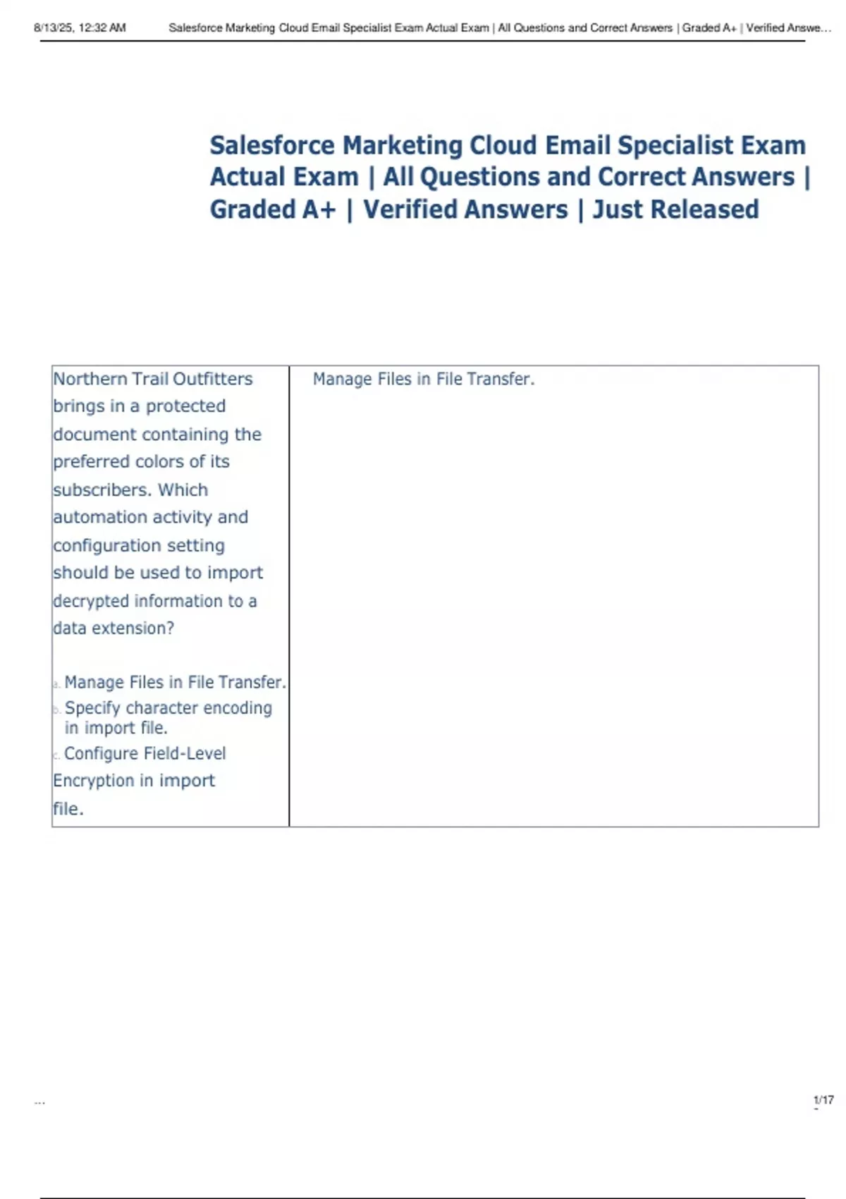 , 8/13/25, 12:32 AM Salesforce Marketing Cloud Email Specialist Exam Actual Exam | All Questions and Correct Answers | Graded A+ | Verified Answe…