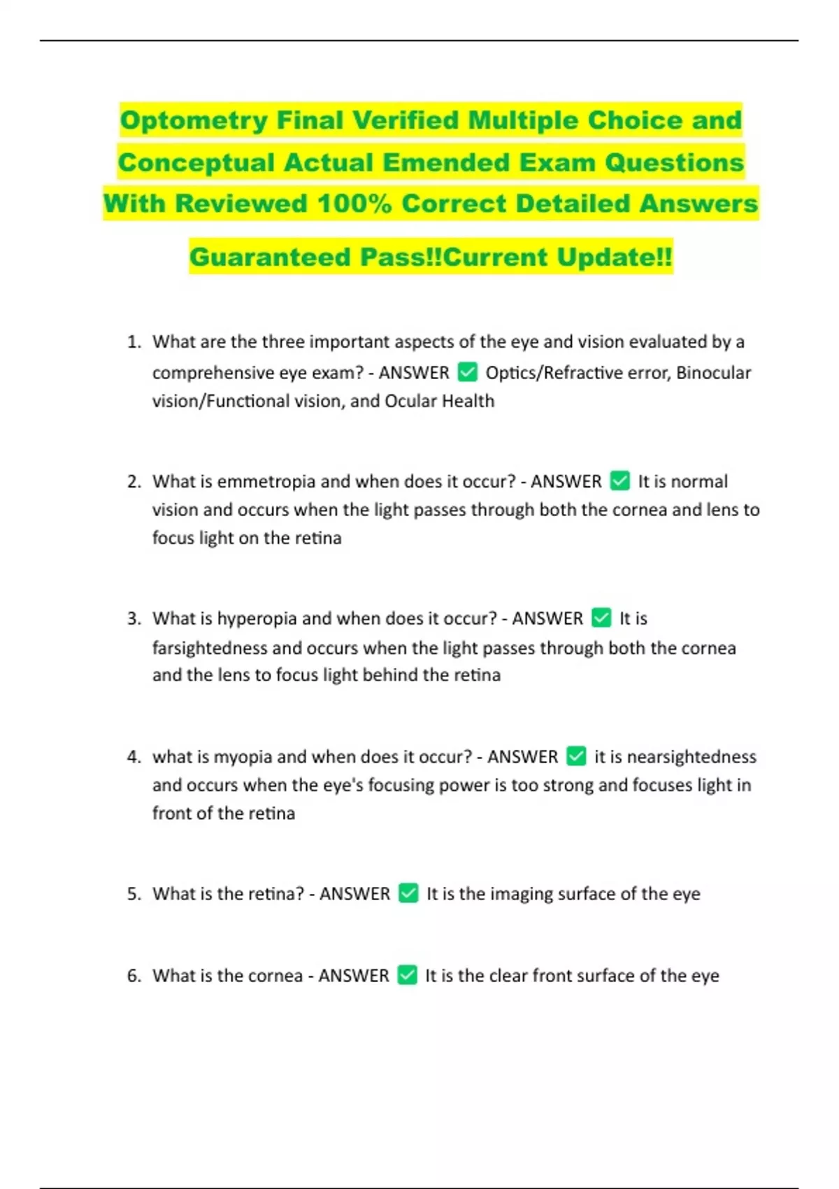6. What is the cornea - ANSWER It is the clear front surface of the eye