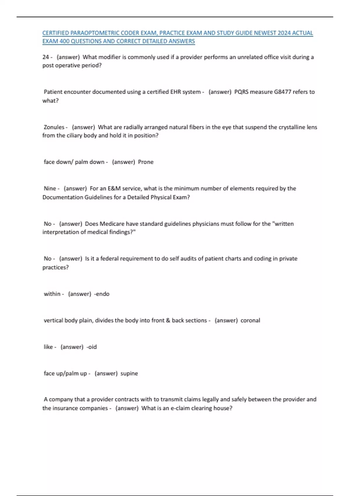 CERTIFIED PARAOPTOMETRIC CODER EXAM, PRACTICE EXAM AND STUDY GUIDE NEWEST 2024 ACTUAL EXAM 400 QUESTIONS AND CORRECT DETAILED ANSWERS