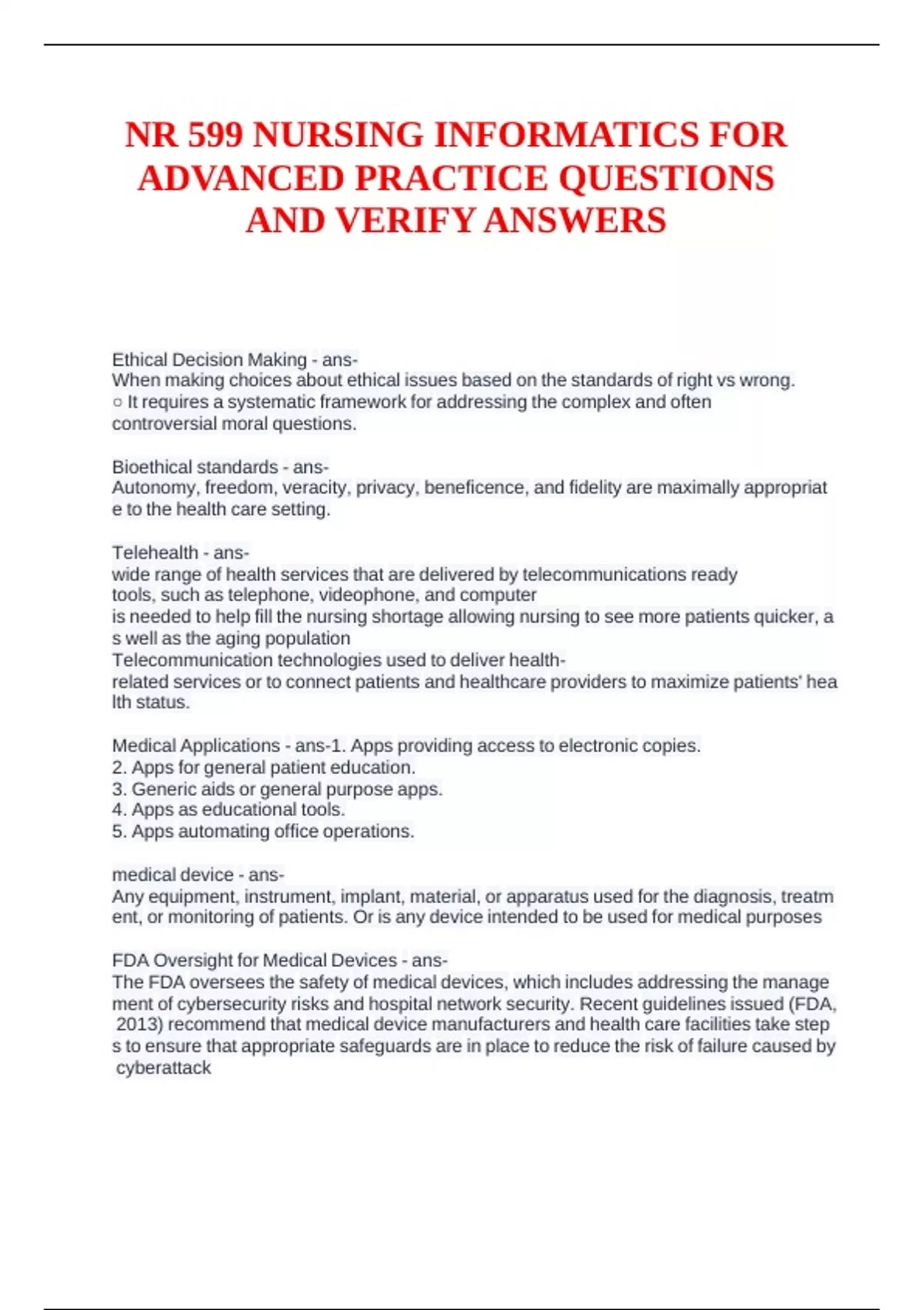 NR 599 NURSING INFORMATICS FOR ADVANCED PRACTICE QUESTIONS AND VERIFY ANSWERS