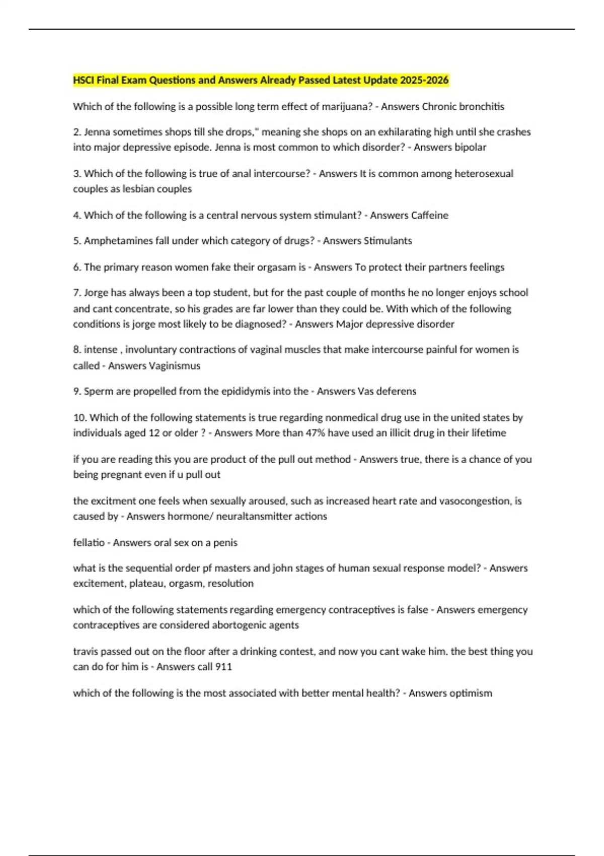 HSCI Final Exam Questions and Answers Already Passed Latest Update Which of the following is a possible long term effect of marijuana? - Answers Chronic bronchitis 2. Jenna sometimes shops till she drops," meaning she shops on an exhilarating high until she crashes into major depressive episode. Jenna is most common to which disorder? - Answers bipolar 3. Which of the following is true of anal intercourse? - Answers It is common among heterosexual couples as lesbian couples 4. Which of the following is a central nervous system stimulant? - Answers Caffeine 5. Amphetamines fall under which category of drugs? - Answers Stimulants 6. The primary reason women fake their orgasam is - Answers To protect their partners feelings 7. Jorge has always been a top student, but for the past couple of months he no longer enjoys school and cant concentrate, so his grades are far lower than they could be. With which of the following conditions is jorge most likely to be diagnosed? - Answers Major depressive disorder 8. intense , involuntary contractions of vaginal muscles that make intercourse painful for women is called - Answers Vaginismus 9. Sperm are propelled from the epididymis into the - Answers Vas deferens 10. Which of the following statements is true regarding nonmedical drug use in the united states by individuals aged 12 or older ? - Answers More than 47% have used an illicit drug in their lifetime if you are reading this you are product of the pull out method - Answers true, there is a chance of you being pregnant even if u pull out the excitment one feels when sexually aroused, such as increased heart rate and vasocongestion, is caused by - Answers hormone/ neuraltansmitter actions fellatio - Answers oral sex on a penis what is the sequential order pf masters and john stages of human sexual response model? - Answers excitement, plateau, orgasm, resolution which of the following statements regarding emergency contraceptives is false - Answers