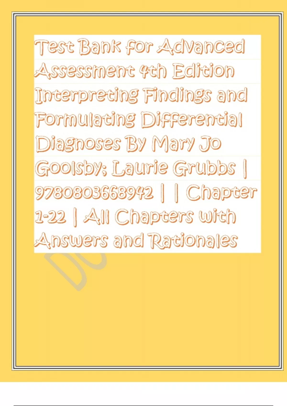 Test Bank for Advanced Assessment 4th Edition Interpreting Findings and Formulating Differential diagnosis questions with correct and verified answers with elaborate rationale