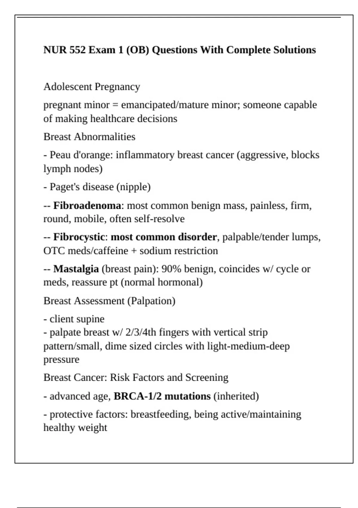 NUR 552 Exam 1 (OB) Questions With Complete Solutions