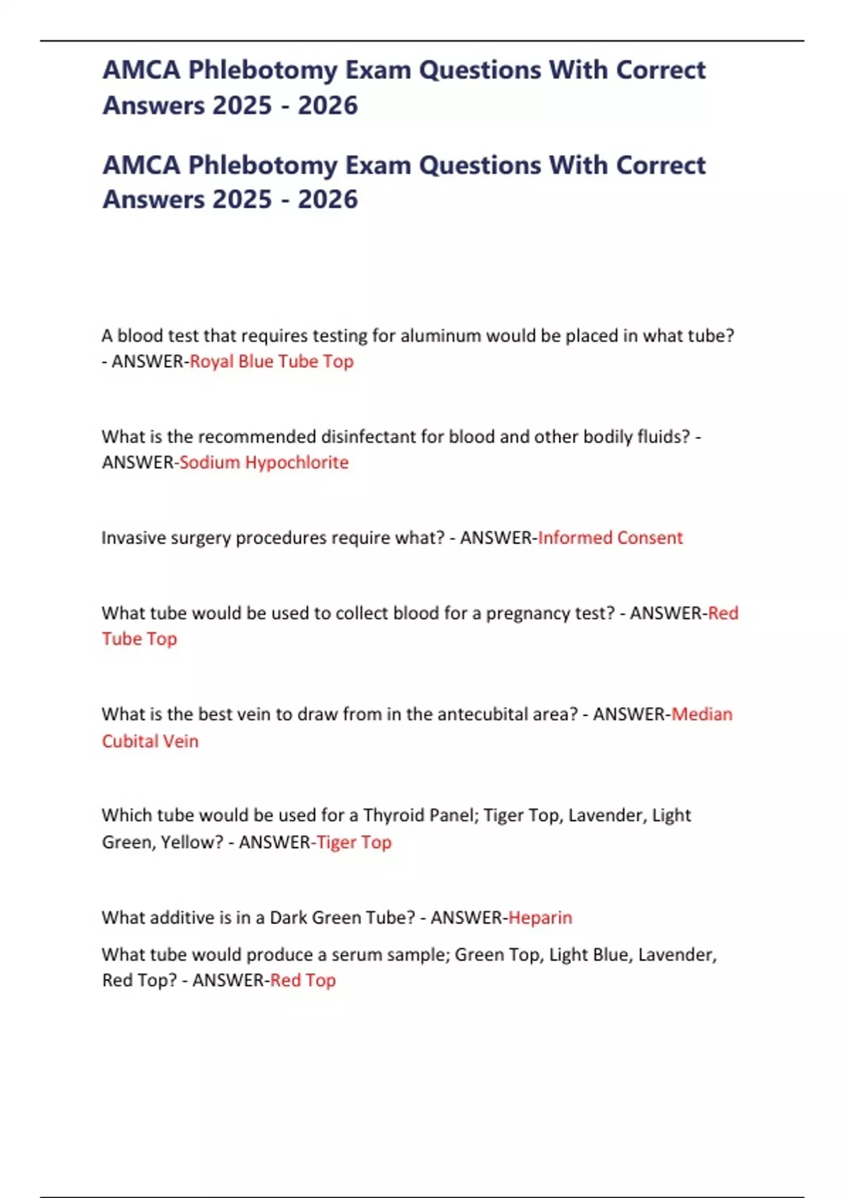 AMCA Phlebotomy Exam Questions With Correct Answers /AMCA Phlebotomy Exam Questions With Correct Answers /AMCA Phlebotomy Exam Questions With Correct Answers
