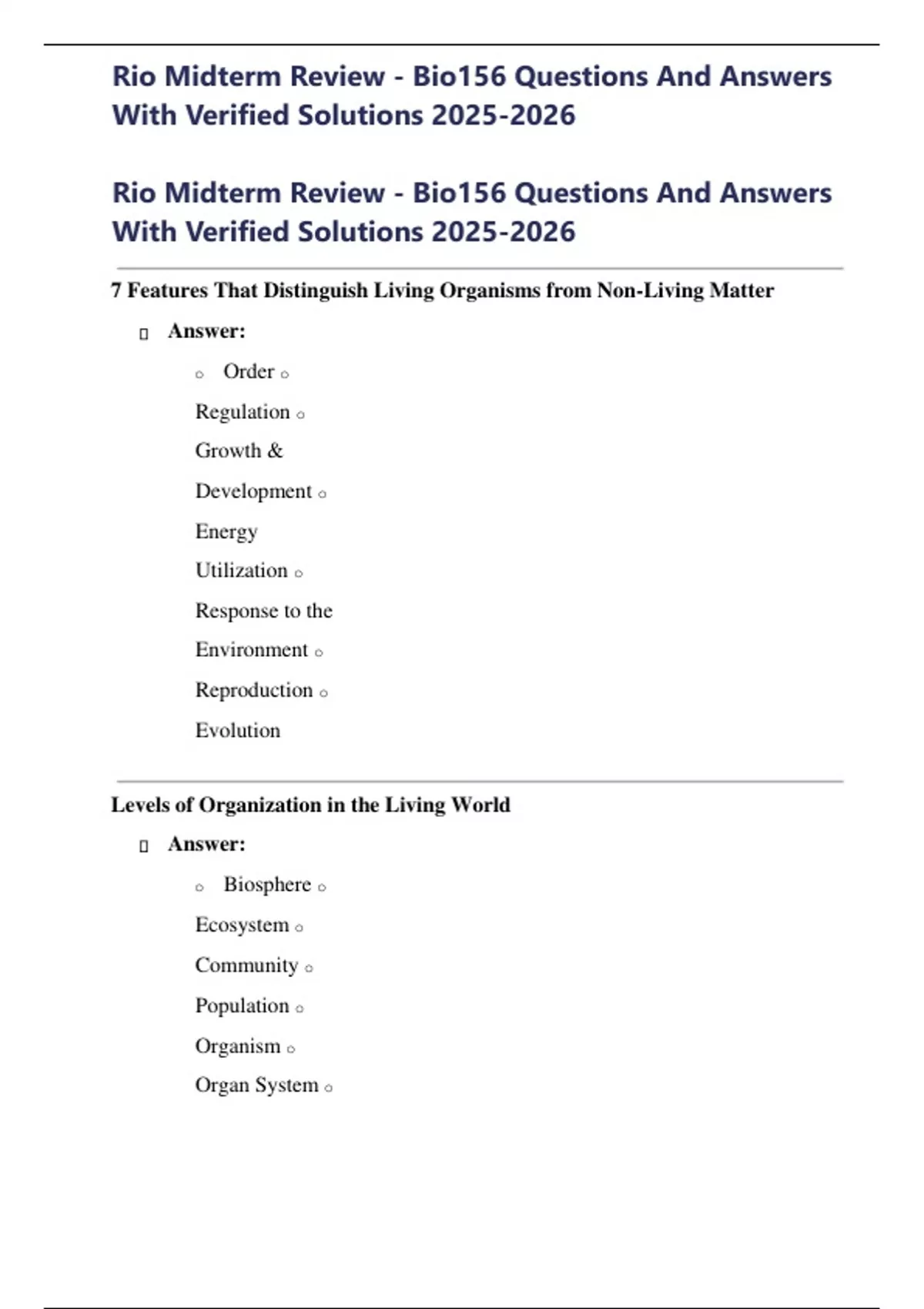 Rio Midterm Review - Bio156 Questions And Answers With Verified Solutions /Rio Midterm Review - Bio156 Questions And Answers With Verified Solutions /Rio Midterm Review - Bio156 Questions And Answers With Verified Solutions
