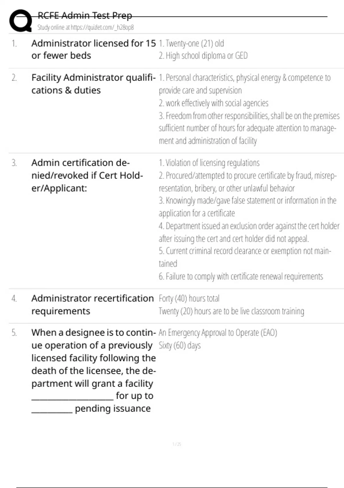 1. Administrator licensed for 15 1. Twenty-one (21) old
