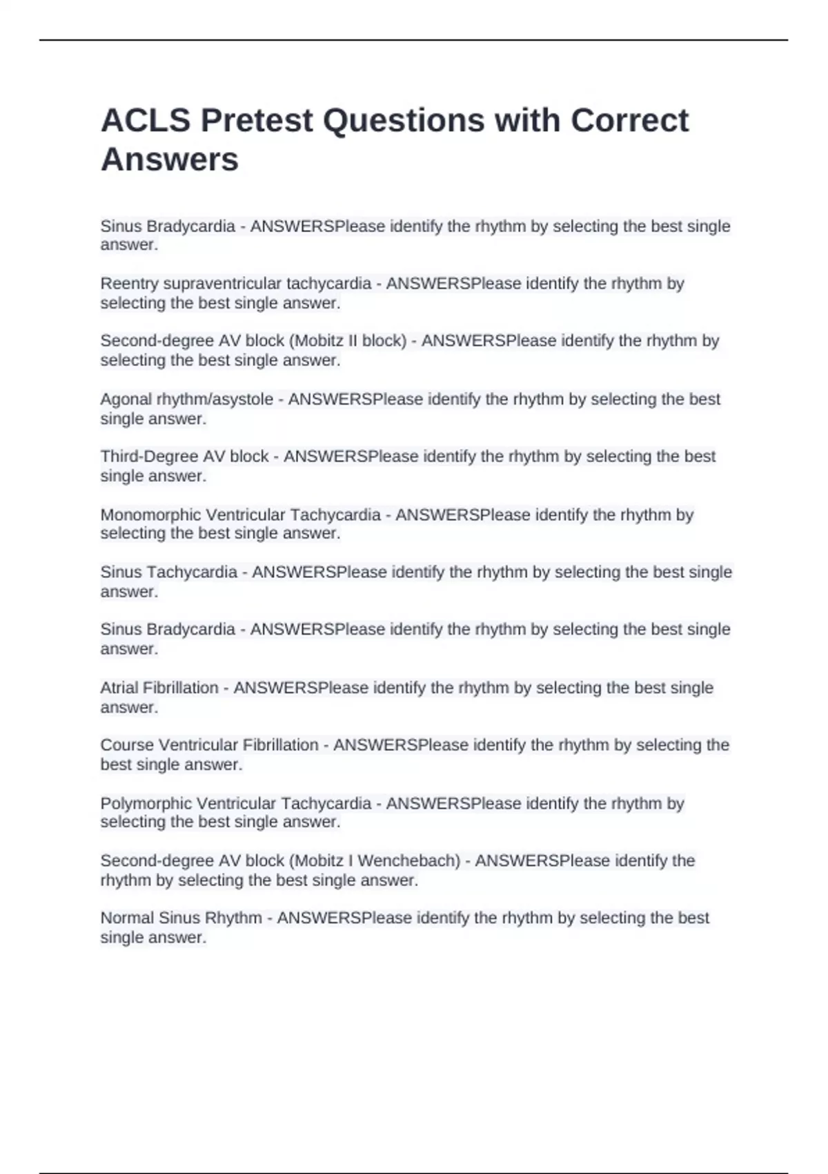 Sinus Bradycardia - ANSWERSPlease identify the rhythm by selecting the best single answer. Reentry supraventricular tachycardia - ANSWERSPlease identify the rhythm by selecting the best single answer. Second-degree AV block (Mobitz II block) - ANSWERSPlease identify the rhythm by selecting the best single answer. Agonal rhythm/asystole - ANSWERSPlease identify the rhythm by selecting the best single answer. Third-Degree AV block - ANSWERSPlease identify the rhythm by selecting the best single answer. Monomorphic Ventricular Tachycardia - ANSWERSPlease identify the rhythm by selecting the best single answer. Sinus Tachycardia - ANSWERSPlease identify the rhythm by selecting the best single answer. Sinus Bradycardia - ANSWERSPlease identify the rhythm by selecting the best single answer. Atrial Fibrillation - ANSWERSPlease identify the rhythm by selecting the best single answer. Course Ventricular Fibrillation - ANSWERSPlease identify the rhythm by selecting the best single answer. Polymorphic Ventricular Tachycardia - ANSWERSPlease identify the rhythm by selecting the best single answer. Second-degree AV block (Mobitz I Wenchebach) - ANSWERSPlease identify the rhythm by selecting the best single answer. Normal Sinus Rhythm - ANSWERSPlease identify the rhythm by selecting the best single answer.